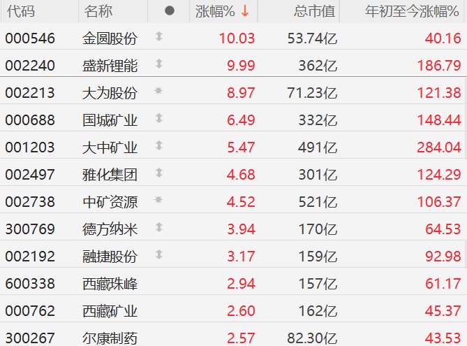11月18日,A股市场锂矿股继续上涨,其中,金圆股份、盛新锂能涨停,大为股份涨近9%,国城矿业涨超6%,大中矿业涨超5%,雅化集团、中矿资源涨超4%。消息面上,碳酸锂期货主力合约涨超4%,现报96560元/吨。
