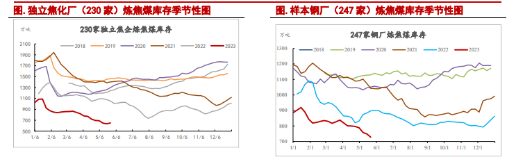 3.产地去库,下游补库。矿山库存报342.07万吨(-10.64),洗煤厂精煤库存192.99万吨(-25.95)。247家钢厂库存727.9万吨(-20.7),230家焦企库存650.96万吨(+15.26)。港口库存209.91万吨(+13.33)。