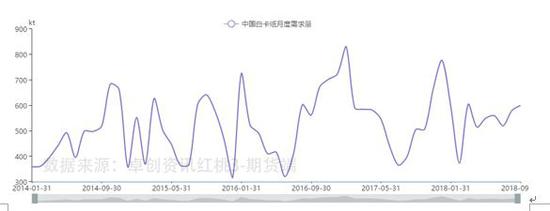 近五年白卡纸价格走势各异,2014-2015年因产能集中投放,白卡纸价格下跌不断,2016-2017年,产能扩张放缓,白卡纸不断上涨。2018年1-8月份白卡纸价格走势较去年减弱,但较前几年仍旧高位,并未跌至2014-2015年低位。2018年1-9月份白卡纸最高价出现在一季度,在6450元/吨上下,同比上涨5%-15%;最低价在7月份,在5150元/吨左右,同比下降15%以上。2018年上半年白卡纸下降主要有以下原因:首先,原料木浆价格下降,针叶浆、化机浆下降明显,阔叶浆走势偏弱,白卡纸成本减轻;其次,随着江苏企业有序推进新项目,白卡纸供应增加预期增强,市场竞争加剧,价格快速下跌;最后,因环境治理等下游需求收紧,备货态度谨慎,市场交投两淡。下半年随着企业再次局部联合,市场竞争稍有减弱,白卡纸价格呈现涨势。