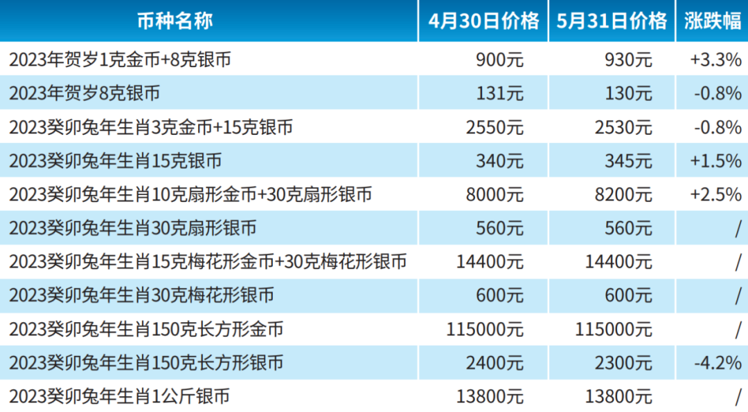 2022吉祥文化金银币各币种5月价格变化如下: