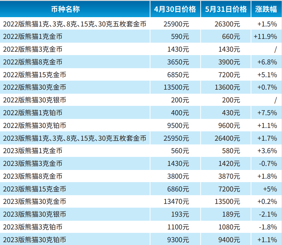 受到国际黄金、白银价格波动及市场货源的影响,2022版熊猫贵金属纪念币大部分币种的价格在5月出现了上涨。