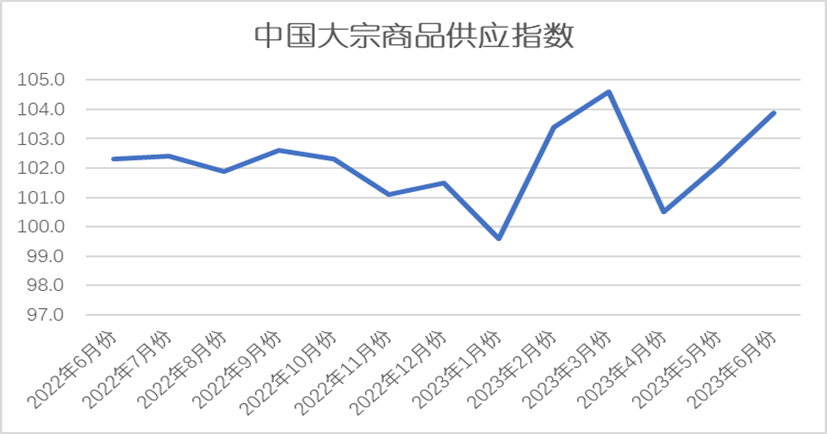 由中国物流与采购联合会调查、发布的2023年6月份中国大宗商品指数(CBMI)为102.8%,指数连续两个月上升,本月较上月上升2.1个百分点。各分项指数中,供应指数连续两个月上升,销售指数止跌反弹,库存指数有所回落。从指数的变化情况来看,本月指数继续上升,且供需双侧联动上扬,特别是需求端回升力度强于供应端,令市场库存压力持续缓解,显示在宏观预期改善的刺激下,大宗商品市场需求恢复,市场人气有所积聚,采购、生产等经营活动积极,6月份国内大宗商品市场呈现“供需双旺、稳中向好”的特征。对于即将到来7月份,我们仍持谨慎态度,具体表现在:在宏观面,国内经济复苏较为温和,民间投资、外贸出口和房地产等对经济的拉动作用偏弱,预计后期政策仍有加码空间,将对市场信心带来提振;在需求端,高温和多雨季节来临,全国性的需求淡季特征趋于明显,预计7月份需求将会出现回落;在供给端,虽然今年以来大多数的时间生产企业均处于亏损状态,但企业减产动力不足,商品供应整体仍处于高位状态,预计后期供应端总量即使出现回落,但供应端仍将强于需求端,市场供过于求的状态将会持续。综合来看,7月份大宗商品市场将会呈现供强需弱的格局,但政策托举的预期客观存在,在二者的博弈下,大宗商品价格将维持区间波动,整体小幅走低。 一、商品供应持续增加 2023年6月份,大宗商品供应指数两连升至107.0%,较上月上升1.8个百分点,显示随着国内经济温和复苏,加之需求恢复以及生产利润有所修复,生产企业对后市预期良好,生产热情高涨,国内大宗商品市场供应量持续增加,供应压力不断加大。从各主要商品来看,本月煤炭供应指数升至2020年8月份以来的最高,各类商品供应量较上月均有所增加,其中钢铁供应量时隔两个月后再现增长态势,且除成品油供应量增速略有减缓外,其余品种均呈现增速加快的格局。