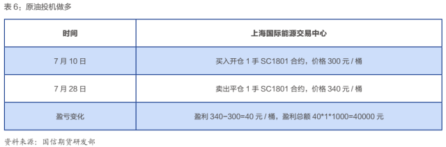 当时原油现货价格为52美元/桶,原油4月份期货合约价格为 54 美元 / 桶,于是该企业在期货市场卖出了50 手原油期货合约进行保值操作。到了 3 月下旬,原油现货和期货价格同步下跌,其交易和损益情况如表5。 在该案例中,企业通过在期货市场进行卖出套期保值操作,虽然原油现货价格下跌了6美元/桶,但由于其卖出原油期货合约的交易,使其获得了6美元/桶的期货利润。 综合计算,可见在原油价格下跌过程中,企业利用期货市场套期保值操作完全对冲了价格下跌对企业的不利影响,提前锁定了销售价格和利润,起到稳定企业经营的效果。 期货投机交易指在期货市场上以获取价差收益为目的的期货交易行为。投机者根据自己对期货价格走势的判断,作出买进或卖出的决定,如果这种判断与市场价格走势相同,则投机者平仓出局后可获取投机利润;如果判断与价格走势相反,则投机者平仓出局后承担投机损失。 由于投机的目的是赚取差价收益,所以,投机者一般只是平仓了结持有的期货合约,而不进行实物交割。 在期货市场,投机交易必不可少,它起到了增加市场流动性和承担套期保值者转嫁风险的作用,还有利于期货交易的顺利进行和期货市场的正常运转,它是期货市场套期保值功能和发现价格功能得以发挥的重要条件之一。 根据买卖方向的不同,期货投机交易可以分为投机做多和投机做空两种类型。 做多就是估计后市要涨,于是买入期货合约,日后价格涨了后,以高价卖出期货合约,赚取差额利润;做空就是估计后市要跌,于是卖出期货合约,日后价格跌了后,以低价买入期货合约,赚取差额利润。 当市场处于牛市上涨趋势中,或者当市场处于下跌尾声,触底开始反弹时,可以进行投机做多操作。通过先买入开仓,然后在更高价位卖出平仓,获取中间价差收益。 7 月 10 日,某期货交易者甲期货账户有资金100 万元,通过分析认为原油价格后市会上涨,于是在上海国际能源交易中心开仓做多 1 手原油期货SC1801 合约,开仓买入价格为 300 元 / 桶,假设保证金率为 10%(实际按期货公司公布标准收取),即需使用保证金 : 到了7 月 28 日,SC1801 合约上涨到了 340 元 /桶,甲在这个价位选择了平仓。平仓盈利总额(340-300)*1*1000=40000 元。不考虑佣金成本,则这笔交易盈利额 40000 元,相对甲账户本金 100 万元,收益率为 4%;相对所占用保证金 30000 元,收益率为133.33%。其交易和损益情况如表 6。 当市场处于熊市下跌趋势中,或者当市场处于上涨尾声,见顶回调时,可以进行投机做空操作。通过先卖出开仓,然后在更低价位买入平仓,获取中间价差收益。 6 月 6 日,某期货交易者乙期货账户有资金 100万元,通过分析认为原油价格后市会下跌,于是在上海国际能源交易中心开仓做空 1 手原油期货 SC1709合约,开仓卖出价格为 330 元 / 桶,假设保证金率为 10%(实际按期货公司公布标准收取),需使用保证金: