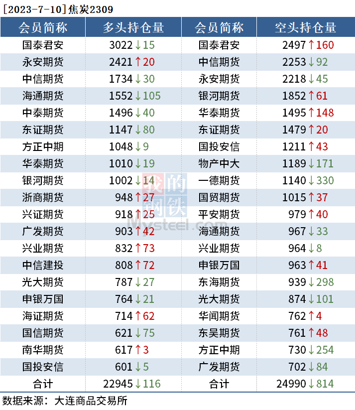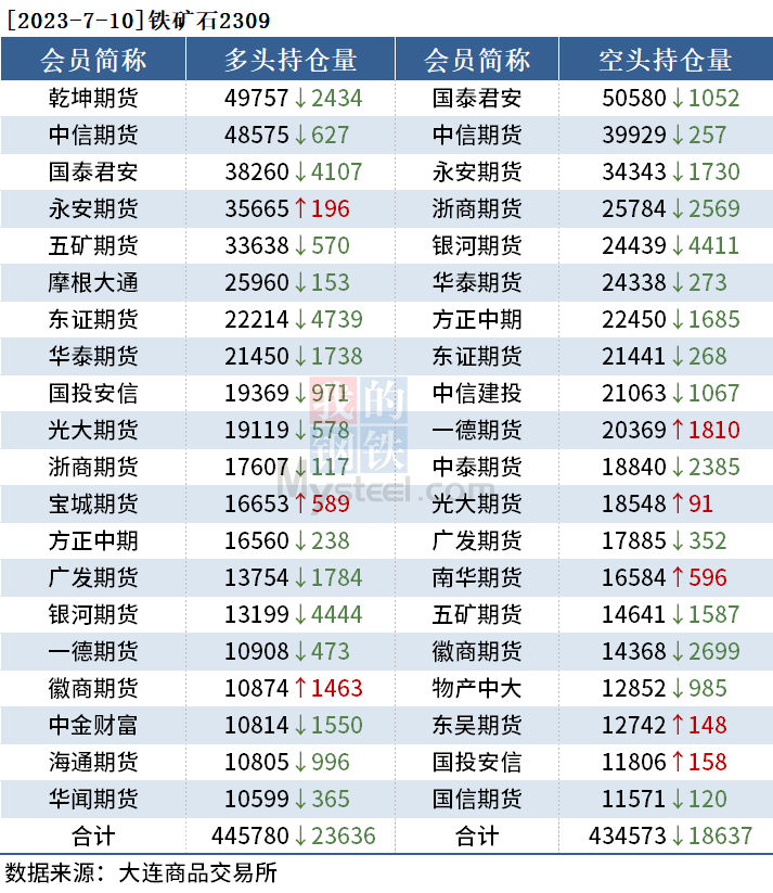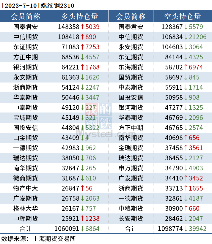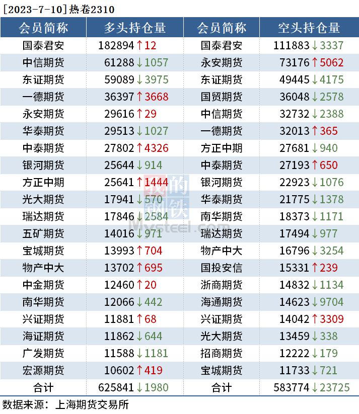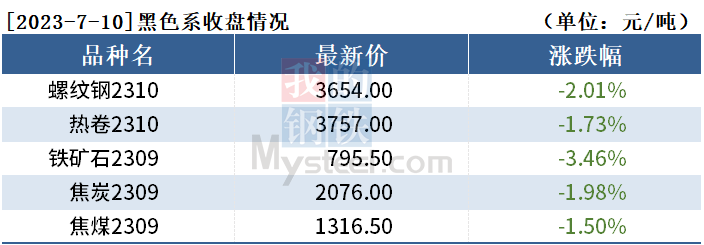 截至7月10日收盘,螺纹钢2310收3654元/吨,跌2.01%;热卷2310收3757元/吨,跌1.73%;铁矿石2309收795.5元/吨,跌3.46%。