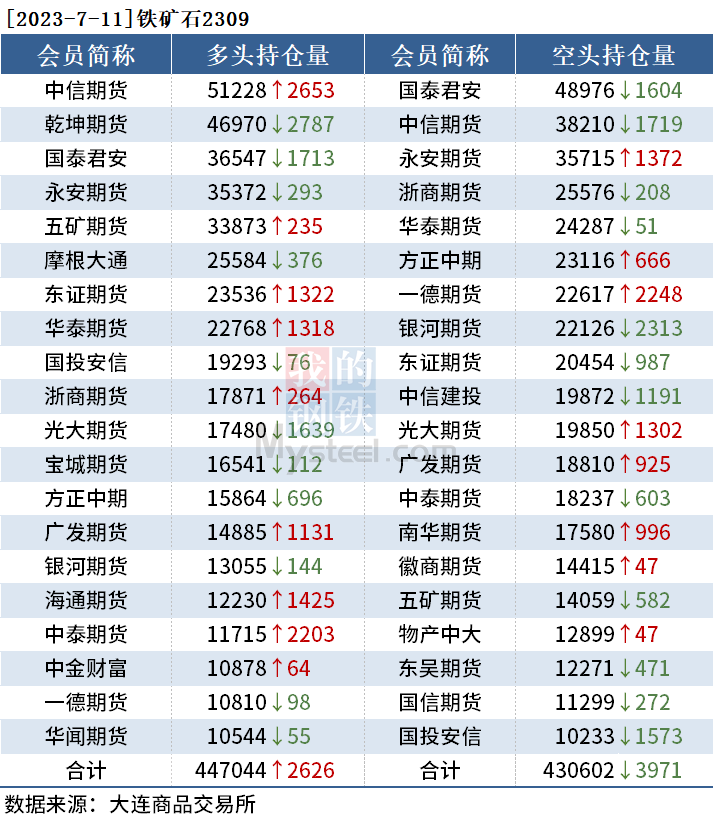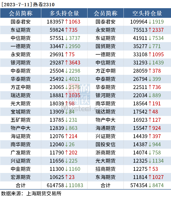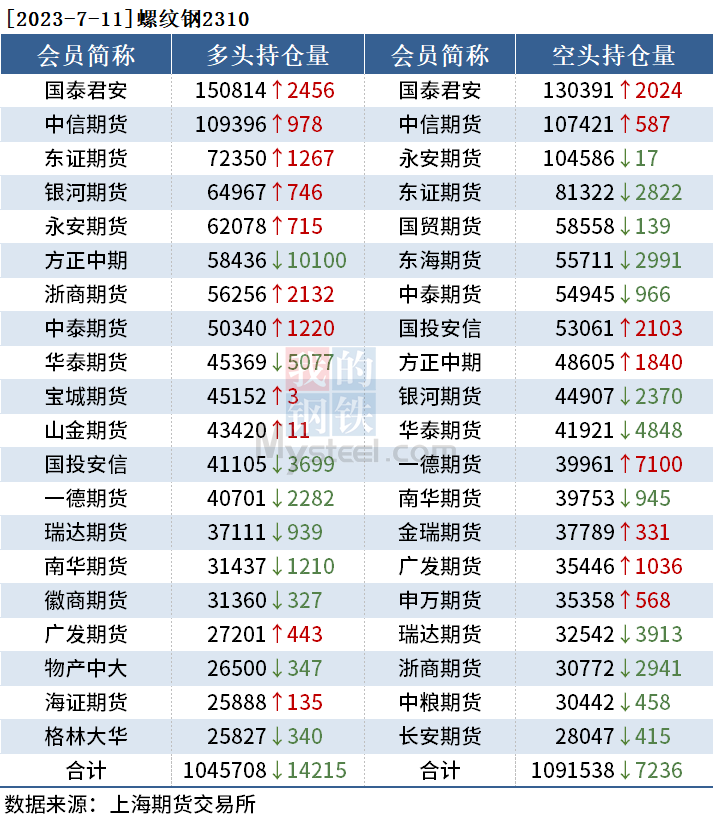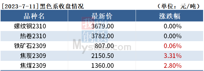 截至7月11日收盘,螺纹钢2310收3679元/吨,持平;热卷2310收3782元/吨,持平;铁矿石2309收807元/吨,涨0.06%。