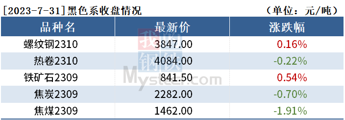 截至7月31日收盘,螺纹钢2310收3847元/吨,涨0.16%;热卷2310收4084元/吨,跌0.22%;铁矿石2309收841.5元/吨,涨0.54%。