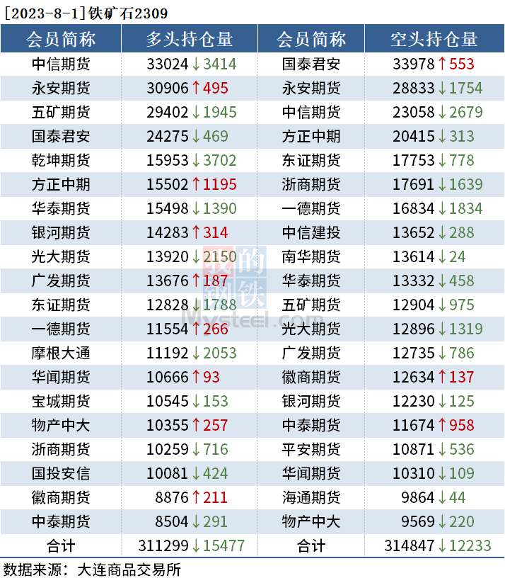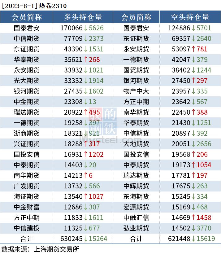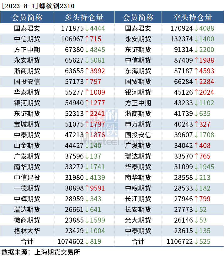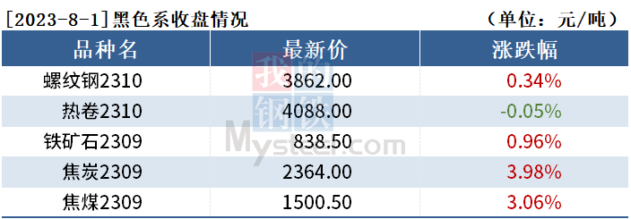 截至8月1日收盘,螺纹钢2310收3862元/吨,涨0.34%;热卷2310收4088元/吨,跌0.05%;铁矿石2309收838.5元/吨,涨0.96%。