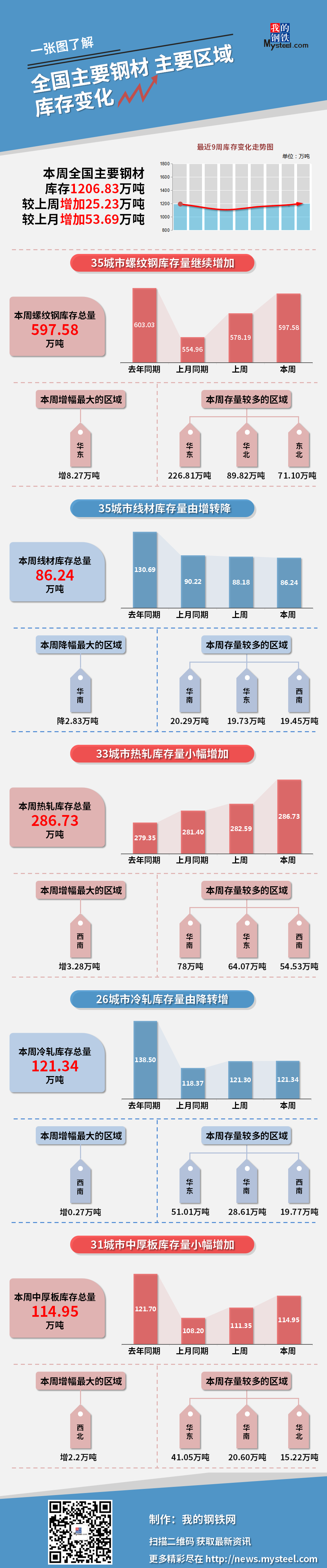 本周,全国主要钢材社会库存1206.83万吨,较上周增加25.23万吨,较上月增加53.69万吨;螺纹钢库存总量597.58万吨。