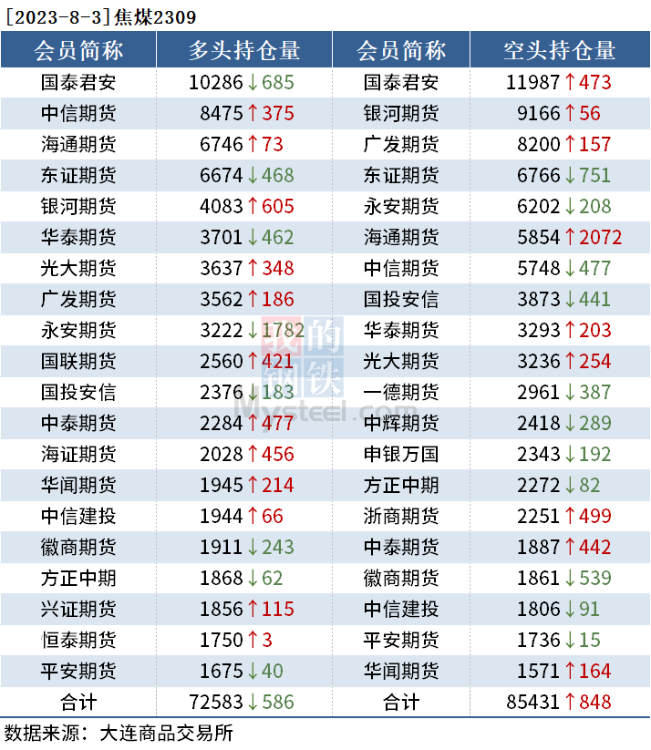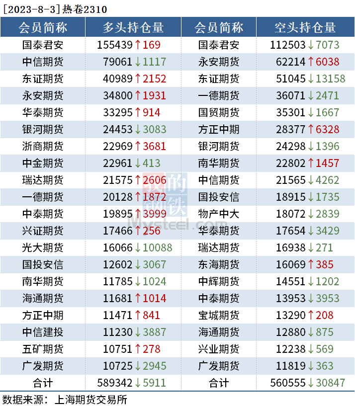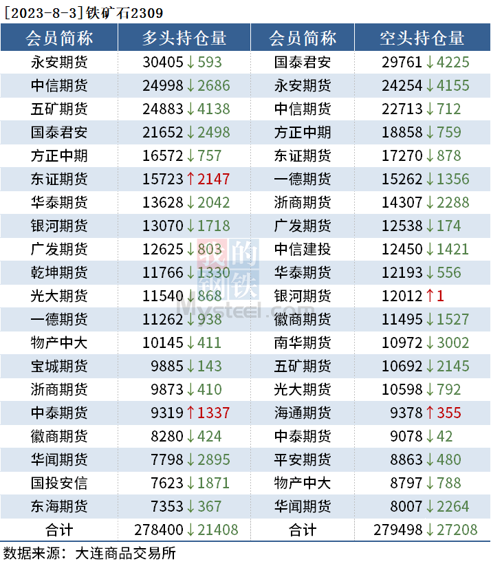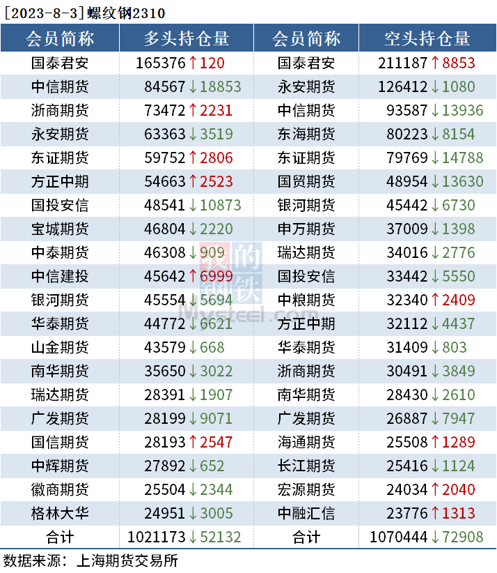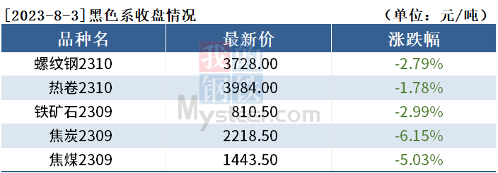 截至8月3日收盘,螺纹钢2310收3728元/吨,跌2.79%;热卷2310收3984元/吨,跌1.78%;铁矿石2309收810.5元/吨,跌2.99%。