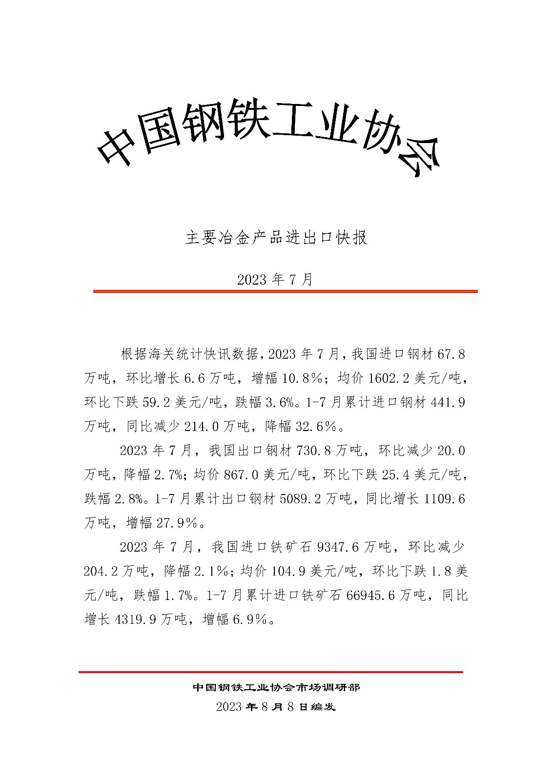 根据海关统计快讯数据,2023 年7月,我国进口钢材 67.8万吨,环比增长6.6万吨,增幅10.8%;均价1602.2美元/吨,环比下跌59.2美元/吨,跌幅 3.6%。1-7月累计进口钢材441.9万吨,同比减少 214.0万吨,降幅 32.6%。