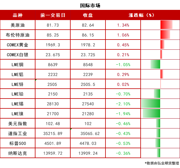 弘业期货 郑重声明:本资讯内容仅供参考,据此入市,风险自担 今日关注 一线观察 8月7日(周一15:30) 隔夜市场 【隔夜要闻】 美联储理事鲍曼表示,美联储可能需要进一步加息,以全面恢复物价稳定。鲍曼表示,她支持上个月美联储会议上加息的决定。尽管此后发布的数据显示价格增长放缓,但鲍曼表示她希望看到更多持续通货紧缩的证据。此外,她还对银行资本提案表示批评。 环球时报援引美国《华尔街日报》当地时间5日报道,在太平洋海域进行第三次联合海上巡逻的中俄海军舰队,于日前进入美国阿拉斯加州附近国际海域,美军北方司令部发言人证实了这一消息。 波兰管道运营商PERN表示,“友谊”输油管道发生泄漏,预计在周二早上恢复输油。 俄罗斯副总理诺瓦克表示,俄罗斯石油产量保持在950万桶/日。6月份欧佩克+减产协议执行率超过100%。2023年全球石油需求将增长240万桶/日。 沙特阿美:将9月销往亚洲的阿拉伯轻质原油官方售价定为较阿曼迪拜均价升水3.50美元/桶。 央行就银行间债券市场柜台业务有关事项的通知征求意见:将机构投资者交易品种增加债券借贷和衍生品。另外,央行还表示,必要时可再创设新货币政策工具,持续支持重点领域、薄弱环节;指导银行依法有序调整存量个人住房贷款利率。 国家发改委:根据形势变化及时分批出台实施一批针对性更强、力度更大储备政策。 各地房地产政策频出。郑州:8月7日起购买新建商品房最低首付降为20%;南京:对购买新建商品住房实施补贴,对集体土地房屋征收推行房票安置;北京市住建委:大力支持刚性和改善性住房需求,相关细则正积极推进中。 【隔夜市场数据】