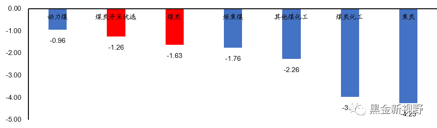⚫本周煤炭开采洗选板块下跌1.26%,动力煤板块下跌0.96%,炼焦煤板块下跌1.76%;焦炭板块下跌4.25%,煤炭化工下跌3.97%。 图 2:A股煤炭及焦化板块区间涨跌幅(%)