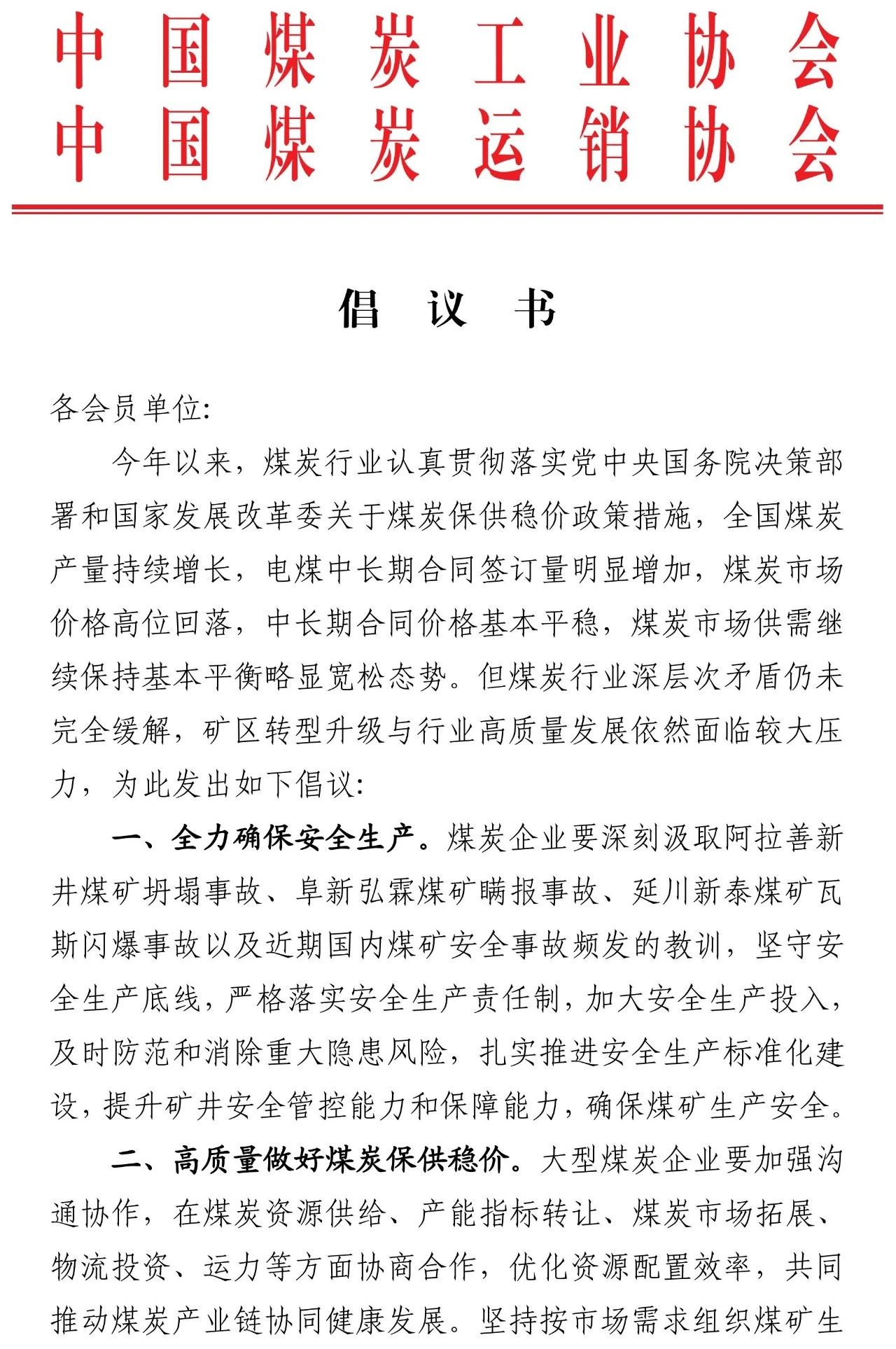 今年以来,煤炭行业认真贯彻落实党中央国务院决策部署和国家发展改革委关于煤炭保供稳价政策措施,全国煤炭产量持续增长,电煤中长期合同签订量明显增加,煤炭市场价格高位回落,中长期合同价格基本平稳,煤炭市场供需继续保持基本平衡略显宽松态势。但煤炭行业深层次矛盾仍未完全缓解,矿区转型升级与行业高质量发展依然面临较大压力,为此发出如下倡议: