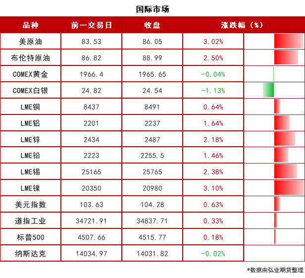 弘业期货 美国8月季调后非农就业人口录得18.7万人;失业率录得3.8%,创去年2月以来新高。两项数据均高于预期。数据公布后,市场定价美联储今年再次加息的可能性较低。互换市场充分定价美联储降息25个基点的时间从明年6月提前至5月。 美联储梅斯特表示,尽管有迹象表明美国劳动力市场正在趋于更好的平衡,但美国劳动力市场依然强劲,同时她还指出,通胀仍然过高,未来的利率决定将基于即将公布的数据。 北京、上海官宣“认房不认贷”政策措施,一线城市集体落实“认房不认贷”。南宁、安徽、苏州也相继官宣认房不认贷。上海“认房不认贷”首日,中介店长称,当天二手房预约带看量增一半。 中证报称,开发商否认深圳、广州楼盘连夜涨价。 证监会指导证券交易所出台加强程序化交易监管系列举措,强化对高频交易的差异化监管安排。