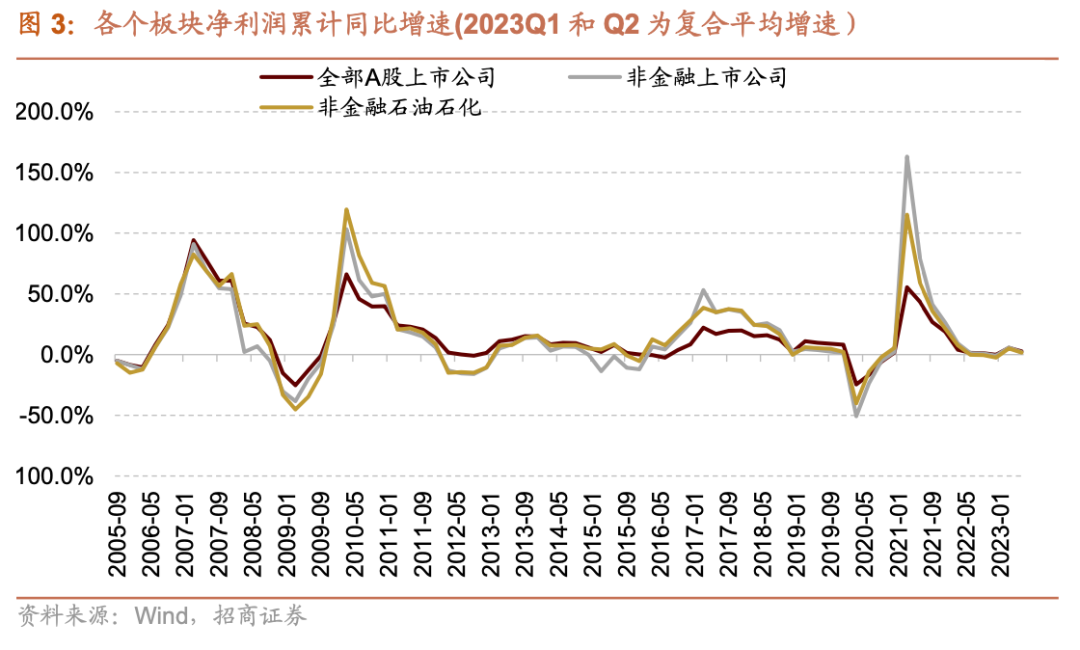 剔除基数因素干扰后非金融增速收窄。以2021H1作为基期测算复合平均增速。全部A股/非金融石油石化2023H1复合平均增速分别为2.7%/1.6%,相比Q1有所下滑。 二季度A股盈利走弱主要受以下因素影响:1)PPI持续下滑,整体收入端增速放缓;2)出口中枢相比一季度下移,对中游板块的拉动作用减弱;3)猪肉价格低迷使得农林牧渔板块对消费板块带来一定拖累;4)费用红利减弱。