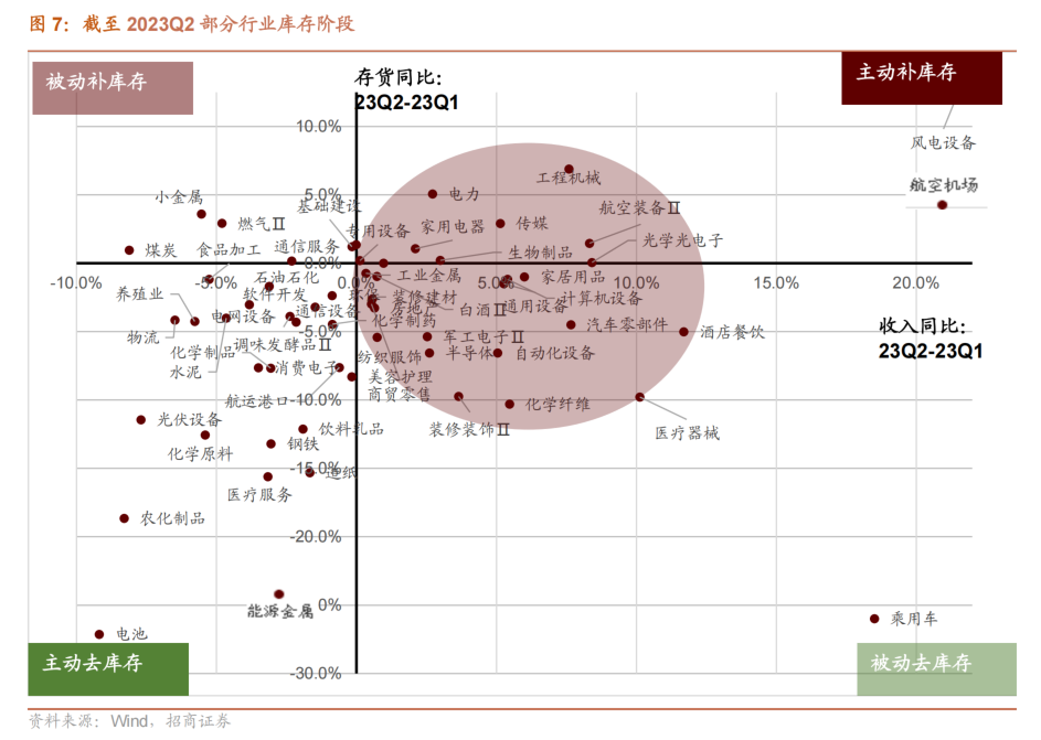 行业层面,最新披露的中报数据来看,相比一季度多数行业已经从主动去库存阶段过渡到被动去库存阶段。1)目前仍处于主动去库存阶段的行业主要集中在资源品领域如:钢铁、能源金属、化学制品、石油石化、化学原料、农化制品等以及养殖业和部分必须消费品领域。2)进入被动去库存的行业主要集中在中游制造如自动化设备、通用设备、汽车零部件、乘用车,部分可选消费如酒店餐饮、美容护理,部分TMT如半导体、计算机设备、军工电子以及化学制药、医疗器械等。3)进入主动补库存的行业主要有航空机场、家用电器、传媒、电力、工程机械等盈利率先改善的领域。推荐关注库存去化较为充分和进入到被动去库存阶段、后续盈利改善动力较强的中游制造、TMT和医药领域的细分行业如半导体、自动化设备、通用设备、汽车零部件、计算机设备、家电、化学制药等。