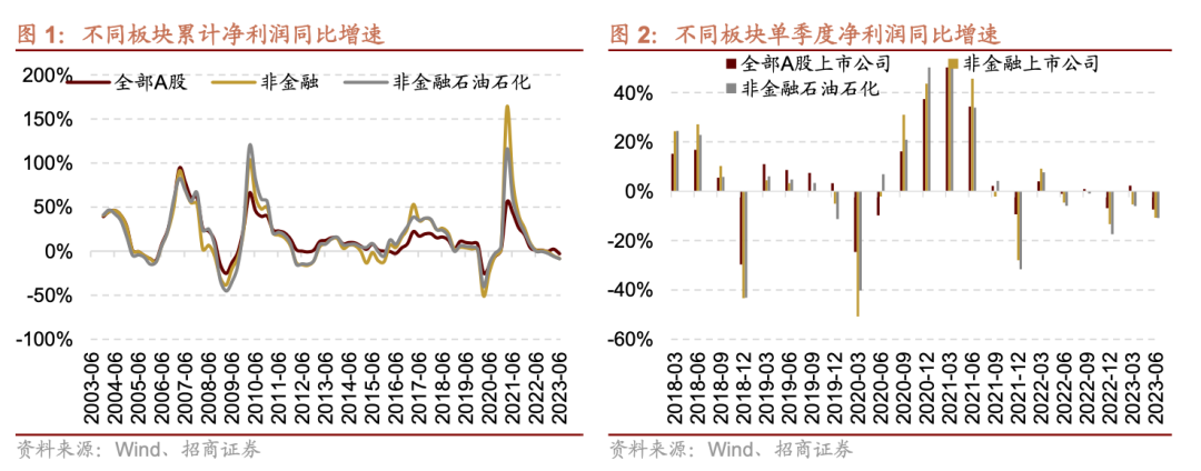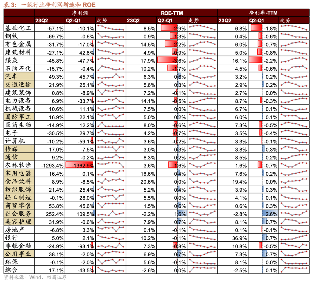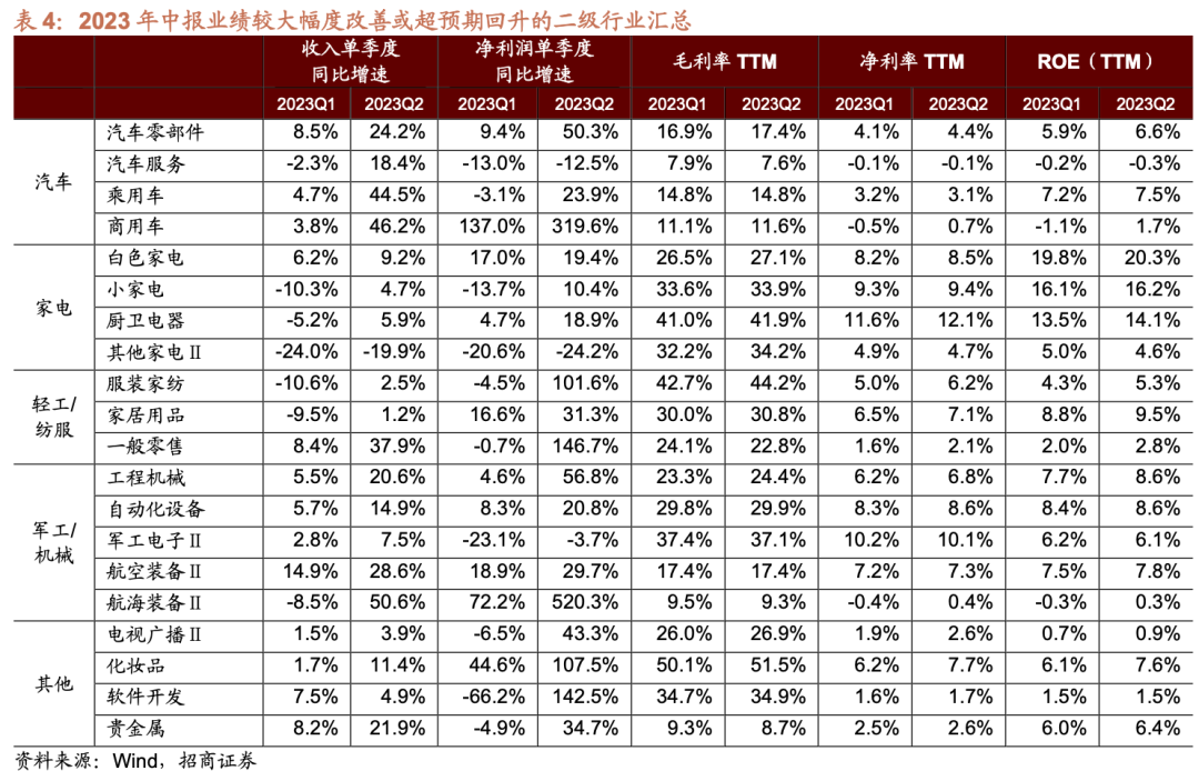⚑ 汽车:乘用车、商用车、汽车零部件、汽车服务 一季度受价格战影响市场成交量低迷,汽车行业盈利承压。二季度汽车新品密集推出,叠加促销力度加大,消费热情持续释放,在去年较低基数背景下,乘用车市场持续高景气,新能源汽车优势也不断扩大,渗透率持续上升。与此同时,随着中国品牌竞争力的提升,汽车出口连创新高,重卡出口保持强劲势头。多重利好因素催化下汽车板块业绩快速回暖。 汽车行业23Q2单季度收入增速由23Q1的5.3%扩大至34.0%,单季度净利润增速由23Q1的3.7%扩大至49.3%,ROE-TTM由23Q1的5.7%扩大至6.3%。细分领域中乘用车、商用车、汽车零部件、汽车服务表现亮眼,净利润增速分别由23Q1的-3.13%、136.98%、9.45%和-12.95%恢复至23.88%、319.55%、50.29%和-12.49%,收入增速分别由23Q1的4.74%、3.82%、8.55%和-2.26%恢复至44.53%、46.20%、24.20%和18.45%。其中商用车ROE-TTM由负转正至1.69%,汽车服务ROE-TTM略有下降,其它细分行业均有回暖。 ⚑ 家电:白色家电、小家电、厨卫电器、其他家电Ⅱ 家用电器板块受益于地产竣工端持续复苏,家电换新和新装需求向好,叠加原材料价格下行,成本压力减轻,二季度业绩延续回暖,表现超市场预期。22Q4、23Q1和23Q2单季度收入增速分别为-8.5%、3.6%和7.6%,单季度净利润增速分别为0.8%、16.3%和16.4%。 细分领域中白色家电、小家电和厨卫电器表现亮眼。白色家电二季度净利润增速由23Q1的16.98%扩大至19.38%,收入增速由23Q1的6.16%扩大至9.20%,ROE-TTM恢复至20.34%。小家电受益于外销收入增长,二季度净利润增速由23Q1的-13.69%转正至10.42%,收入增速由23Q1的-10.28%转正至4.70%,ROE-TTM恢复至16.20%。厨卫电器二季度净利润增速由23Q1的4.73%恢复至18.89%,收入增速由23Q1的-5.22%转正至5.90%,ROE-TTM恢复至14.06%。其他家电Ⅱ业绩仍然承压,收入端延续改善,22Q4、23Q1、23Q2单季度净利润增速分别为-37.51%、-23.98%、-19.85%。 ⚑ 轻工/纺服:服装家纺、家居用品 二季度国内需求延续弱复苏,刺激消费政策效果逐渐显现,叠加大宗商品价格回落,成本压力减轻,轻工制造、纺织服饰板块业绩有所回暖。23Q2轻工制造行业单季度净利润增速为-0.1%,相较一季度降幅收窄28个百分点,细分行业中家居用品表现超预期;23Q2纺织服饰行业单季度净利润增速由负转正至21.4%,相较去年年底明显复苏,细分行业中服装家纺表现较好。 家居用品主要受益于原材料价格回落以及企业降本增效成果显著,细分业务中定制家居表现亮眼,带动板块盈利超预期修复,单季度收入增速由23Q1的-9.52%转正至1.21%,单季度净利润增速由23Q1的16.62%扩大至31.30%,ROE-TTM由8.83%恢复至9.53%。待房地产销售在政策刺激落地后持续回暖,作为典型的地产链消费行业,家居业绩在下半年有望持续改善。 服装家纺受益于展业持续复苏,线下商圈回暖,利润端快速修复。二季度净利润增速由23Q1的-4.49%快速转正至101.56%,收入增速由23Q1的-10.63%转正至2.52%,ROE-TTM由4.27%恢复至5.31%。 ⚑ 军工/机械:军工电子Ⅱ、航空装备Ⅱ、航海装备Ⅱ、工程机械、自动化设备 “十四五”武器装备建设下,更新换代需求继续放量,叠加海外订单逐渐恢复,国防军工板块业绩快速回暖,部分企业规模效应显现,盈利能力明显改善。需求弱复苏背景下,机械设备行业内销未出现明显回暖迹象,但海外业务拓展顺利,市占率有所提高,出口方面持续高景气,带动行业业绩快速恢复。 国防军工板块23Q2单季度净利润增速由23Q1的-5.2%转正至16.9%,单季度收入增速由23Q1的4.3%复苏至23.0%。细分行业中军工电子Ⅱ、航空装备Ⅱ、航海装备Ⅱ表现较好,净利润增速分别由23Q1的-23.13%、18.87%和72.20%恢复至-3.67%、29.73%和520.34%,收入增速分别由23Q1的2.80%、14.89%和-8.51%恢复至7.46%、28.57%和50.60%。 机械设备板块23Q2单季度净利润增速由负转正至10.6%,单季度收入增速由23Q1的3.5%复苏至9.3%。细分行业中工程机械、自动化设备表现较好,净利润增速分别由23Q1的4.58%和8.30%快速恢复至56.75%和20.82%,收入增速分别由23Q1的5.54%和5.73%恢复至20.62%和14.85%,ROE-TTM分别由7.70%和8.36恢复至8.65%和8.65% 2、延续改善:食品饮料/可选/出行消费/银行/部分TMT 二季度A股盈利整体走弱,或已见底,行业表现分化持续,有部分行业延续了较高的盈利增速,主要集中在食品饮料(白酒Ⅱ、非白酒、饮料乳品、休闲食品)、可选/出行消费(铁路公路、航空机场、旅游零售Ⅱ、酒店餐饮、旅游及景区、专业服务、教育、影视院线、医疗美容)、银行(城商行Ⅱ、农商行Ⅱ、股份制银行Ⅱ、国有大型银行Ⅱ)等、部分TMT(通信服务、通信设备、游戏Ⅱ、出版)等。