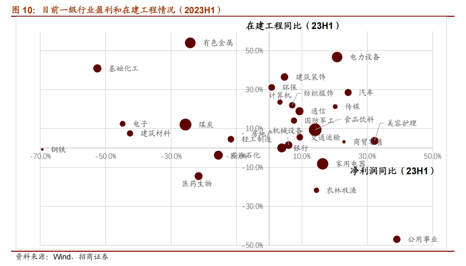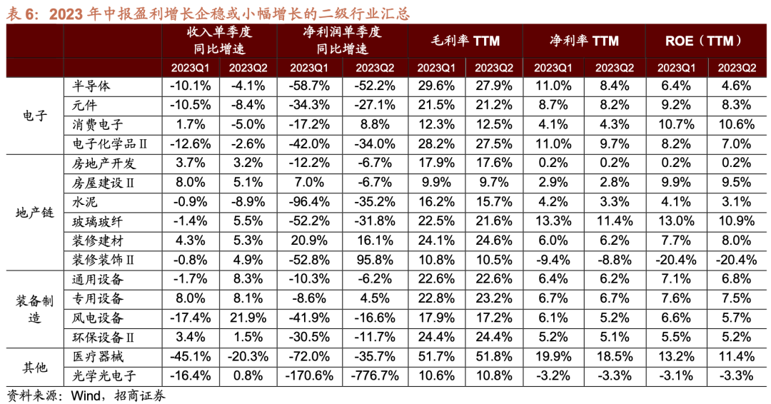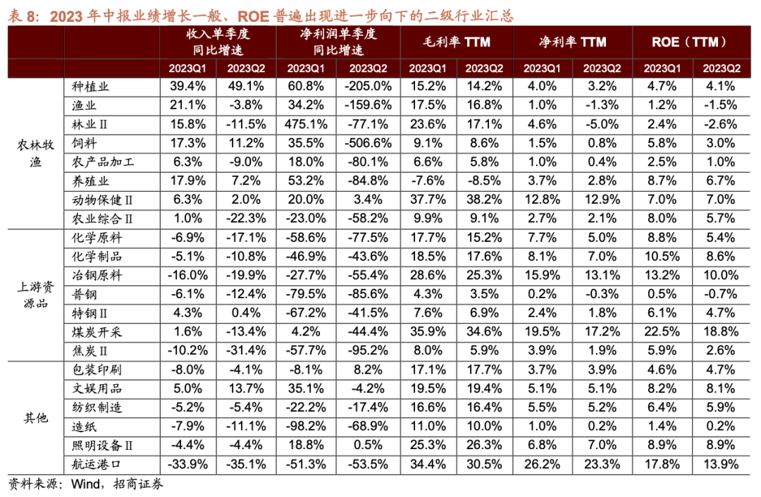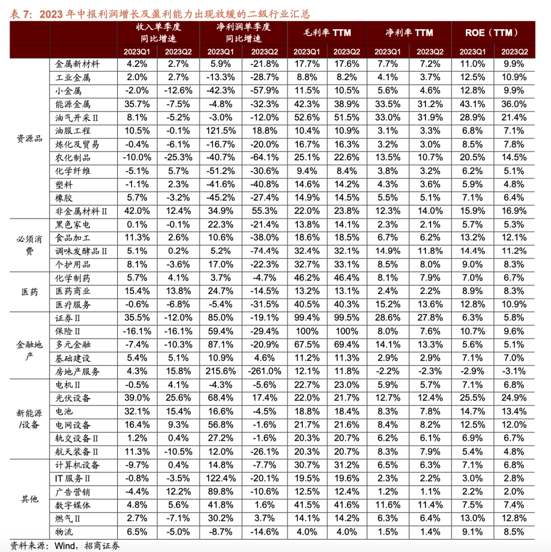 ⚑ 电子(半导体、元件、电子化学品、消费电子) 一季度受需求疲软拖累,电子板块业绩承压明显,二季度末全球半导体销售额同比降幅持续收窄,面板价格持续上涨,行业复苏迹象初显,叠加企业库存持续去化,资本开支也较为谨慎,电子板块Q2业绩环比上行,单季度收入降幅和单季度利润降幅均有所收窄,呈边际复苏态势。细分行业中,半导体、元件、电子化学品和消费电子复苏迹象较为明显。其中,消费电子Q2单季度净利润同比由负转正至8.77%,增幅扩大25.95个百分点;半导体、元件和电子化学品Q2单季度净利润同比降幅较前值分别收窄了6.52、7.19、8.01个百分点,单季度收入同比降幅较前值分别收窄了5.97、2.14、9.96个百分点。 ⚑ 地产链(装修建材、水泥、玻璃纤维、装修装饰Ⅱ、房屋建设Ⅱ、房地产开发等) 上半年在“保交楼”政策托底下,房地产竣工端整体延续回暖,叠加成本端下行,疫后复苏背景下存量家装需求持续放量,海外需求释放,装修建材、水泥、玻璃纤维等行业业绩在基建地产总量需求偏弱的情况下仍有边际复苏迹象。 建筑材料行业二季度营业收入增速转负,净利润增速降幅有所收窄,整体仍然承压。细分领域中装修建材、水泥、玻璃纤维均有不同程度的改善,装修建材行业单季度收入增速连续两个季度回升,ROE-TTM持续修复至7.97;水泥行业Q2单季度净利润增速同比降幅收窄61.21个百分点,8月以来水泥价格也出现止跌企稳迹象,后续旺季有望继续改善;玻璃纤维行业Q2单季度收入增速由负转正至5.48%,单季度净利润增速同比降幅收窄20.32个百分点,盈利能力有所回升。 建筑装饰行业业绩增速放缓,其中装修装饰Ⅱ行业业绩实现边际复苏。建筑装饰行业营收增速持续放缓,盈利能力也有所下降,Q2单季度收入增速放缓至6.4%,单季度净利润增速下降至0.8%。装修装饰Ⅱ行业需求尚有支撑,幕墙项目逐步恢复正常,叠加企业积极拓展业务,行业Q2单季度收入增速由负转正至4.85%,单季度净利润增速快速修复,由负转正至95.79%,增幅达到148.58个百分点。 房地产开发行业二季度净利润增速降幅收窄,Q2单季度收入增速放缓,盈利能力修复。二季度单季度净利润同比降幅收窄5.51个百分点至-6.70%,盈利能力有所回升。 ⚑ 装备制造(通用设备、专用设备、风电设备、环保设备Ⅱ) 装备制造领域在一季度业绩触底后,二季度业绩回暖、部分周期行业复苏,上游原材料价格波动影响减弱、整体盈利能力稳步上升。叠加本轮去库存周期接近尾声,海外需求旺盛出口高增,行业初现复苏态势。 通用设备与专用设备行业受原材料价格影响较大,随着二季度以来原材料价格逐步走低,地产链逐步回暖,下游需求呈现弱复苏态势,行业二季度净利润增速降幅收窄,业绩实现边际复苏。分领域来看,通用设备行业单季度收入增速连续两个季度回升,净利润增速由23Q1的-10.29%收窄4.07个百分点至-6.22%;专用设备行业二季度营收增速扩大至8.07%,净利润增速由负转正至4.47%,ROE-TTM修复至7.52%。 风电设备:受益于海风建设进程加速,二季度风场开工进度改善、风电装机量大幅提升,海外需求稳定增长打开行业增长空间,叠加原材料价格下跌盈利能力改善,风电设备板块迎来复苏。风电设备二季度营收增速大幅改善,由23Q1的-17.38%上升39.31个百分点至21.93%,净利润增速由23Q1的-41.93%上升25.36个百分点至-16.57%,毛利率、净利率、ROE-TTM分别下浮0.68、0.83、0.90个百分点至17.24%、5.22%、5.75%。 4、增速放缓:资源品/必须消费/金融地产/医药其他 部分行业二季度盈利增速放缓,主要有资源品领域的工业金属、能源金属、油气开采Ⅱ、塑料等,必须消费相关的黑色家电、食品加工、调味发酵品Ⅱ、个护用品,医药领域的化学制药、医药商业、医疗服务,金融地产领域证券Ⅱ、保险Ⅱ、多元金融、基础建设、房地产服务,工业制造领域的电机Ⅱ、光伏设备、电池、电网设备、轨交设备Ⅱ、航天装备Ⅱ,以及计算机设备、IT服务Ⅱ、广告营销、物流等细分行业。 资源品:资源品整体受经济下行以及海外央行加息等因素影响,上半年需求较为疲软,盈利增速放缓。细分领域来看,工业金属领域,由于供给具有刚性、需求不及预期,导致部分金属价格持续走弱,二季度板块单季度收入增速为2.72%,单季度净利润增速下行至-28.67%,毛利率、净利率与ROE均下行。能源金属领域,上半年新能源销售疲软、需求承压,锂钴镍整体价格均走低,板块营收增速由2023Q1的35.66%转负至-7.46%,净利润增速继续下行至-32.28%,毛利率、净利率、ROE-TTM分别下降3.40、2.27、7.12个百分点。 必须消费:由于宏观经济复苏不及预期,必须消费品板块部分领域Q2需求疲软,盈利增速放缓。细分领域来看,黑色家电领域,由于市场需求逐步高端化、大屏化,彩电部分均价逐步提升、Q2季度以来小尺寸销量逐步下行,黑色家电领域正延续结构性升级趋势,二季度净利润增速由23Q1的22.27%转负至-21.37%,净利率、ROE-TTM分别下行至2.14%、5.26%。调味发酵品Ⅱ领域与食品加工领域,由于复苏不及预期、行业正处于库存消化阶段,原材料成本与需求双承压,二季度净利润增速均由正转负,调味发酵品Ⅱ领域的收入增速与净利润增速分别由23Q1的5.13%、5.22%下降至0.24%、-74.44%,ROE-TTM由23Q1的14.41%下行至1.24%。,食品加工领域的收入增速与净利润增速分别由23Q1的1.26%、10.64%下行至2.55%、-37.96%,ROE-TTM由23Q1的13.19%下行至12.09%。 