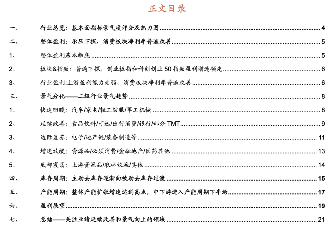 本文以A股2023年中报为依据,考察财务指标、中观景气、估值水平、基金持仓等指标并给与评分,综合判断各个行业的基本面情况以及景气度运行至哪个区间水平,并由此筛选出业绩较好且景气度向上的细分领域。 ⚑ 针对60个可高频跟踪的细分领域,采用中观景气度(利用对于超额收益具有正向贡献的中观景气度指标进行标准化处理)、业绩情况、盈利预期、筹码分布、估值水平、交易分析、周期阶段、赛道及政策等维度,对于各个维度进行量化评分并赋予相应权重,得到各行业的加权平均得分。建议关注行业比较综合得分处于偏上水平且景气趋势向上的细分行业,包括信息科技中的传媒、计算机设备、通信服务、软件开发,中游制造领域的汽车零部件、军工电子、专用设备、部分消费领域的家用电器、白酒等。 ⚑ 整体盈利:A股2023中报业绩整体仍承压。与Q1相比,A股H1业绩增速转负,经济复苏斜率放缓。板块&指数:整体来主要指数收入和净利润增速普遍在继续下探。创业板指和科创创业50指数净利润实现较高增速。风格方面,大盘优于小盘,价值略优于成长。行业:上游盈利普遍走弱,消费板块净利率普遍提升。 ⚑ 本文从财报表现和高频指标出发对于二级行业景气分化做出判断,建议对于景气度延续改善、快速提升的板块给与关注: ⚑快速回暖:尽管整体A股盈利承压,但仍有部分行业受益于原材料价格下降、下游需求逐渐复苏等原因,利润出现较大程度转正或者增幅显著扩大,主要存在以下方向,汽车(乘用车、商用车、汽车零部件、汽车服务)、家电(白色家电、小家电、厨卫电器、其他家电Ⅱ)、轻工/纺服(服装家纺、家居用品)、军工/机械(军工电子Ⅱ、航空装备Ⅱ、航海装备Ⅱ、工程机械、自动化设备)等; ⚑ 延续改善:二季度A股盈利整体走弱,或已见底,行业表现分化持续,有部分行业延续了较高的盈利增速,主要集中在食品饮料(白酒Ⅱ、非白酒、饮料乳品、休闲食品)、可选/出行消费(铁路公路、航空机场、旅游零售Ⅱ、酒店餐饮、旅游及景区、专业服务、教育、影视院线、医疗美容)、银行(城商行Ⅱ、农商行Ⅱ、股份制银行Ⅱ、国有大型银行Ⅱ)等、部分TMT(通信服务、通信设备、游戏Ⅱ、出版)等; ⚑ 边际复苏:部分行业在2023年二季度业绩企稳或小幅正增长,呈现边际复苏态势,主要集中在电子 /地产链/装备制造等领域,如半导体、元件、电子化学品、消费电子、装修建材、水泥、玻璃纤维、装修装饰Ⅱ、房屋建设Ⅱ、房地产开发、通用设备、专用设备、风电设备、环保设备Ⅱ等; ⚑ 增速放缓:部分行业二季度盈利增速放缓,主要有资源品领域的工业金属、能源金属、油气开采Ⅱ、塑料等,必须消费相关的黑色家电、食品加工、调味发酵品Ⅱ、个护用品,医药领域的化学制药、医药商业、医疗服务,金融地产领域证券Ⅱ、保险Ⅱ、多元金融、基础建设、房地产服务,工业制造领域的电机Ⅱ、光伏设备、电池、电网设备、轨交设备Ⅱ、航天装备Ⅱ,以及计算机设备、IT服务Ⅱ、广告营销、物流等细分行业; ⚑ 底部震荡:上游部分领域,受海外央行加息和俄乌冲突对全球宏观经济的影响,上游资源品板块需求低迷、价格下滑、库存压力加大,盈利仍在底部震荡;以及农林牧渔等板块; ⚑ 库存周期:主动去库存逐渐向被被动去库存过渡,库存周期接近尾声,预计今年四季度至明年一季度有望进入新一轮补库存周期。推荐关注库存去化较为充分和进入到被动去库存阶段、后续盈利改善动力较强的中游制造、TMT和医药领域的细分行业如半导体、自动化设备、通用设备、汽车零部件、计算机设备、家电、化学制药等; ⚑ 产能周期:当前产能扩张增速基本达到了较高水平,后续基本进入下半场,预计也对应着新一轮盈利周期的开始。公用事业、资源品、消费服务仍处于扩张上行周期,中游制造业、金融地产,医疗保健、信息技术基本处于产能周期尾声,在建工程同比增速基本增幅持续收敛或转负。预计产能扩张后周期的板块有望率先迎来盈利的改善; ⚑ 综合来看中报业绩表现较好的行业主要集中在:疫后率先回暖并持续复苏的出行链(社会服务、美容护理、商贸零售、交通运输)、内外销共同驱动的(家用电器、汽车、电力设备),此外医药、电子等行业业绩也边际出现改善等。后续业绩有望改善的领域可能主要有:顺周期领域(有色金属、机械设备等);消费服务领域(交运、家用电器、轻工制、食品饮料)、医药科技领域(医药生物、计算机、电子)等,推荐予以关注 风险提示:产业扶持度不及预期,宏观经济波动