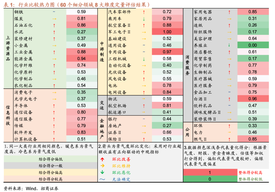 01 行业总览——基本面指标景气度评分及热力图 本文采用中观景气度、业绩情况、盈利预期、筹码分布、估值水平、交易分析、周期阶段、赛道及政策等维度,对于各个维度进行量化评分并赋予相应权重,得到各个行业的加权平均得分,由此筛选出业绩相对较好且景气度向上的行业。以下对于各个维度量化评分标准做出说明: ⚑ 行业选择:以申万行业分类为基础,筛选出60个可进行高频跟踪的细分领域。 ⚑ 中观景气度:利用对于超额收益具有正向贡献的中观景气度指标进行标准化处理,得到每个行业的景气扩散指数(PDI),从而对各个行业的景气度进行横向量化对比。 ⚑ 业绩情况:根据目前该行业业绩所处的历史分位数和环比改善程度进行标准化打分处理 ⚑ 盈利预期:采用分析师一致盈利预期(修正后)和环比改善程度进行标准化打分处理。 ⚑ 筹码分布:根据该行业公募持仓、陆股通持仓比例等历史分位数和环比改善程度进行标准化打分处理。 ⚑ 估值水平:根据目前该行业市盈率历史分位数和环比改善程度进行标准化打分处理 ⚑ 交易分析:根据目前该行业换手率、交易集中度等指标的历史分位数和环比改善程度进行标准化打分处理。 ⚑ 周期阶段:参考招商策略团队的行业轮动示意图。 ⚑ 赛道/政策:作为加分项引入。 建议关注行业比较综合得分处于偏上水平且景气趋势向上的细分行业,包括信息科技中的传媒、计算机设备、通信服务、软件开发,中游制造领域的汽车零部件、军工电子、专用设备、部分消费领域的家用电器、白酒等。