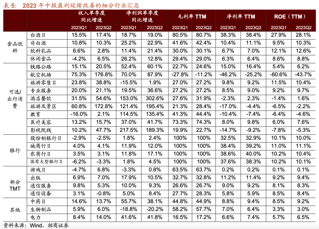⚑ 食品饮料:白酒Ⅱ、非白酒、饮料乳品、休闲食品 2023Q2现饮场景消费进一步复苏,叠加商务需求边际改善,消费升级红利持续,高端白酒和部分次高端白酒业绩改善,非白酒板块中啤酒销量稳健增长,高端化趋势延续。白酒Ⅱ23Q1和23Q2单季度收入增速分别为15.50%和17.4%,单季度净利润增速分别达到18.67%和19.01%,ROE-TTM提升至27.88%和28.14%。非白酒23Q1和23Q2单季度收入增速由负转正至10.77%和10.26%,单季度净利润增速由负转正至25.19%和22.89%,ROE-TTM提升至9.50%和10.30%。 受益于性价比消费趋势和上半年需求延续弱复苏,量版零食店实现快速扩张,叠加多公司加速推出新品,休闲食品板块业绩向好,23Q1和23Q2单季度收入增速分别为-4.15%和6.53%,单季度净利润增速分别达到26.19%和12.77%,ROE-TTM提升至8.65%和8.85%;饮料乳品板块中的低温赛道受益于高温天气以及消费者尝“鲜”心理表现较好,无糖饮料风口下茶饮也持续高增长,23Q1和23Q2饮料乳品行业单季度净利润增速分别达到11.38%和21.35%,ROE-TTM提升至12.07%和12.64%。 ⚑ 可选/出行消费:铁路公路、航空机场、旅游零售Ⅱ、酒店餐饮、旅游及景区、专业服务、教育、影视院线、医疗美容等 去年受疫情反复影响,防疫管控下出行有所收紧,社服中仅教育行业净利润实现正增长,2023年上半年出行链持续复苏,餐饮、旅游、酒店、医美等线下消费场景逐渐回暖,市场需求逐步释放,叠加低基数影响,出行/可选消费板块业绩表现亮眼。 交通运输板块受国内客运需求回暖以及海外航线逐步恢复影响,叠加大宗商品价格回落成本下行,盈利能力有所恢复,二季度净利润增速由23Q1的-3.1%转正至21.9%。细分领域中铁路公路、航空机场持续改善,净利润增速分别由23Q1的52.39%和70.04%扩大至60.08%和87.88%,单季度收入增速分别由23Q1的15.07%和75.31%扩大至20.47%和176.84%,ROE-TTM分别由5.42%和-60.61%恢复至6.16%和-43.70%。 旅游零售Ⅱ受益于全球旅游业持续修复、出入境逐步回暖和机场客流回升,业绩开始企稳。旅游零售Ⅱ23Q1和23Q2单季度收入增速分别为23.76%和38.83%,单季度净利润增速逐步企稳分别为-15.45%和1.94%,ROE-TTM分别为11.47%和10.44%。随着夏季直飞航班逐步上行,跟团游进一步放开,线下销售额有望持续增长,带动下半年行业业绩持续改善。 社会服务板块盈利在22Q2低基数下有较大程度的修复,二季度净利润增速由23Q1的142.8%扩大至252.4%。细分领域中专业服务、酒店餐饮、旅游及景区、教育表现相对较好,净利润增速分别由23Q1的19.53%、153.02%、121.44%和114.51%恢复至36.56%、302.56%、195.38%和135.36%,ROE-TTM分别由9.20%、-1.42%、-6.53%和-6.38%恢复至9.67%、1.63%、-2.22%和-4.61% 此外,影视院线受益于居民观影需求逐步恢复,线下场景延续回暖,五一、暑期档票房超预期,业绩持续较高增长,23Q1和23Q2单季度收入增速分别为10.17%和47.65%,单季度净利润增速分别为217.54%和189.32%。医疗美容行业受“她经济”明显复苏影响,终端类产品销售增长驱动下,业绩实现较高增长,23Q1和23Q2单季度收入增速分别为13.17%和15.73%,单季度净利润增速分别为36.95%和41.65%。 ⚑ 银行:城商行Ⅱ、农商行Ⅱ、股份制银行Ⅱ、国有大型银行Ⅱ 二季度信贷整体仍然偏弱,对公增长较强,居民储蓄意愿较为强烈。银行息差持续收窄拖累业绩,收入端虽持续改善但增幅较小,利润端受益于资产质量优异和拨备反哺继续改善,23Q1和23Q2单季度收入增速分别为-4.4%和-2.4%,单季度净利润增速逐步企稳分别为2.8%和5.0%,ROE-TTM分别为10.3%和10.2%。 细分领域中国有大型银行Ⅱ和股份制银行Ⅱ边际改善,净利润增速分别由23Q1的1.81%和1.81%恢复至4.49%和2.43%,单季度收入增速分别由23Q1的-6.20%和-2.88%恢复至-3.35%和-2.53%。城商行Ⅱ和农商行Ⅱ延续复苏,城商行Ⅱ22Q4、23Q1和23Q2的单季度净利润增速逐渐修复,依次为8.36%、11.92%和11.98%,农商行Ⅱ22Q4、23Q1和23Q2的单季度净利润增速依次为2.64%、11.84%和17.14%,ROE-TTM均持续提高。 ⚑ 部分TMT:通信服务、通信设备、游戏Ⅱ、出版 伴随AIGC应用场景逐步落地,算力需求迅速扩张,5G基站、5G用户数持续增长,三大运营商云业务持续放量,数字化转型业务拓展顺利,另外国产大模型蓬勃发展,较多因素驱动下部分TMT产业业绩明显回暖。 通信板块盈利能力有所增强,23Q2单季度净利润增速为9.2%,ROE-TTM持续提升至8.3%,净利率TTM提升至8.5%。 细分领域中通信服务、通信设备均有不同程度的改善,其中通信服务的ROE-TTM、净利率TTM和毛利率TTM均有所提高,通信设备净利润增速由23Q1的5.01%恢复至8.39%,净利率TTM持续修复至5.93%,毛利率TTM持续修复至28.27%。 传媒板块受益于观影习惯恢复和AI模块应用逐步落地,收入增速延续回暖,单季度收入增速由23Q1的0.5%恢复至10.3%。细分领域在不同程度上渐进式修复,游戏Ⅱ行业受益于版号核发常态化、市场需求逐步回暖、经营正常化,游戏市场实际销售收入边际复苏迹象明显,带动行业盈利改善,单季度净利润增速由23Q1的-3.34%转正恢复至0.76%。出版行业受益于线上渠道销售回暖、业务拓展带来盈利增量,中报表现较好,收入增速持续恢复至7.03%,ROE-TTM持续修复至9.37%。 3、边际复苏:电子/地产链/装备制造等 部分行业在2023年二季度业绩企稳或小幅正增长,呈现边际复苏态势,主要集中在电子 /地产链/装备制造等领域,如半导体、元件、电子化学品、消费电子、装修建材、水泥、玻璃纤维、装修装饰Ⅱ、房屋建设Ⅱ、房地产开发、