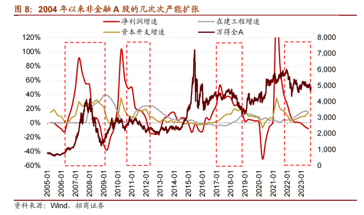 从历史数据来看,wind全A有较好表现往往伴随着全A盈利增速的上行期,产能扩张高点一般出现利润增速高点之后,因此产扩张的初期万得全A往往表现相对一般;而在产能周期的后半段一般对应着新一轮盈利周期的开始,万得全A也开始有较好表现。当前产能扩张增速基本达到了较高水平,后续基本进入下半场,预计也对应着新一轮盈利周期的开始。