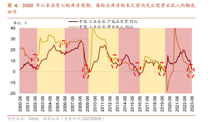 04 库存周期:主动去库存逐渐向被动去库存过渡 2000年以来工业企业经历了七轮存货周期,目前去库存基本接近尾声。我们用工业企业产成品存货同比增速来衡量,2000年至今共有7轮存货周期,每轮平均长度大约为40个月。本轮库存周期自2020年二季度开始,至今已经持续了38个月。从历史数据来看,每一轮库存后期结束之前,均先出现营业收入的触底回升, 今年四月份开始,工业企业营业收入增速出现小幅反弹迹象,主动去库存逐渐向被被动去库存过渡,预计今年四季度至明年一季度有望进入新一轮补库存周期。
