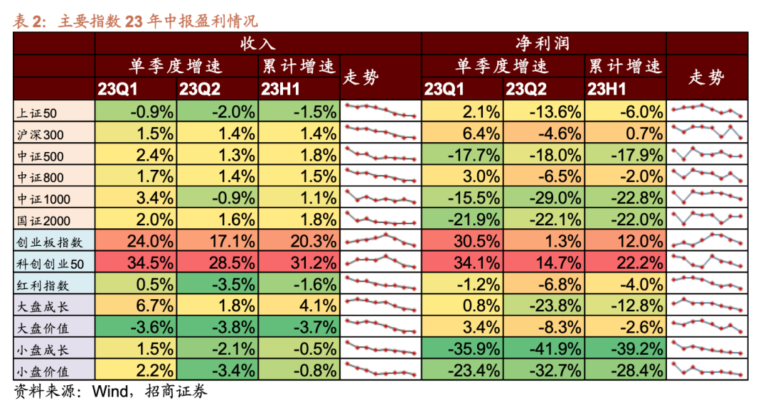 2、板块&指数:普遍下探,创业板指和科创创业50指数盈利增速领先 整体来主要指数收入和净利润增速普遍在继续下探。上证50、沪深300等大盘指数盈利相对稳健;中证1000、中证2000等中小盘指数净利润同比下降较多。创业板指和科创创业50指数净利润实现较高增速(这里由于创业板、科创板内部分化较大,导致指数与整体板块业绩有较大差异) 风格方面,大盘优于小盘,价值略优于成长,其中大盘成长营业收入实现正增长,大盘价值净利润同比降幅最小。