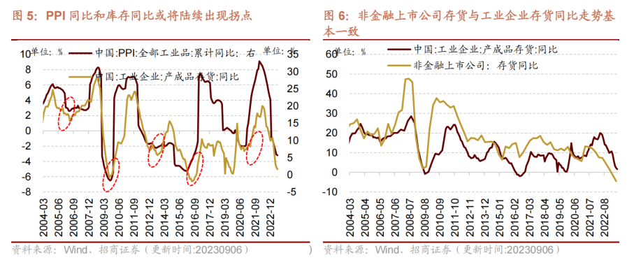 历史数据来看,PPI拐点一般领先库存拐点3-6个月。本轮PPI下行自2021年10月开始,目前已经持续了22个月,最新7月份的数据显示PPI仍在下探,预计三季度末可能会出现拐点,后续库存同比拐点也将在四季度或明年一季度出现。上市公司非金融板块存货同比与工业企业存货同比走势高度一致,因此预计上市公司存货拐点也将在四季度末或明年一季度出现。