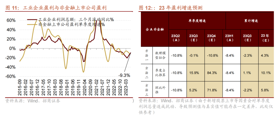06 盈利展望 从工业企业盈利来看,预计A股盈利底部已现。工业企业盈利自2021年3月达到峰值之后持续回落至今年四月份出现拐点。历史数据来看,工业企业盈利上行周期一般是12个月,下行周期是24-36个月左右。目前工业企业盈利增速已经连续四个月反弹,A股盈利拐点已经出现,下半年基本面预计进入上行周期。 这里我们使用三种方法分别测算23年下半年单季度及全年净利润累计增速。 方法一:数理模型拟合。使用2004年以来的非金融企业净利润增速与GDP、CPI、PPI、出口增速、工业增加值等宏观指标建立拟合模型,并基于对下半年的宏观指标预期,计算出非金融A股全年净利润累计同比增速约为2.5%。 方法二:季度占比。我们用2016年以来的数据,计算前三个季度单季度利润占比,一、二、三季度的利润占比分别约为30.7%、35.3%、34.0%;全年维度各季度利润占比约为25.0%、28.7%、27.5%、18.8%。按照各季度占比推算,全年A股/非金融净利润增速约为6.4%/10.1%。 方法三:环比外推。同样使用2016年以来的数据,计算各个季度相比上一季度单季度利润的环比变化的均值,以此计算出2023年三、四季度单季度利润总量。最后计算全年A股/非金融累计净利润同比增速约为3.0%/5.8%。 综合以上预计全年非金融净利润有望实现小个位数增长,增速预计在(0%~5%)。