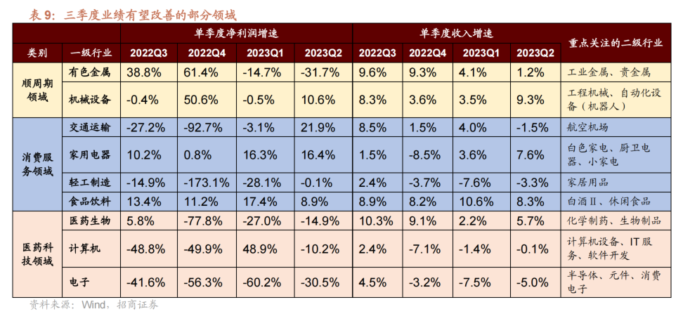 行业层面结合毛利率、净利率改善趋势,行业库存周期和产能周期等方面分析,我们认为三季报开始持续改善并到明年一季度有可能会晋升增速最高的领域可能有:顺周期领域(有色金属、机械设备等);消费服务领域(交运、家用电器、轻工制造、食品饮料)、医药科技领域(医药生物、计算机、电子)等。