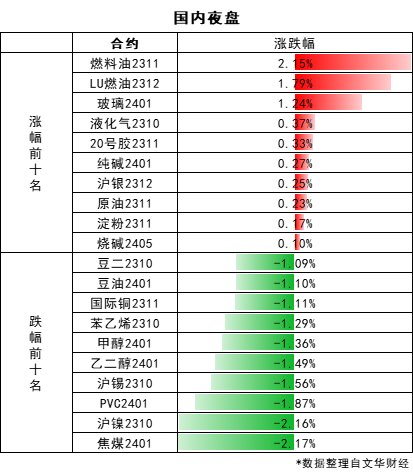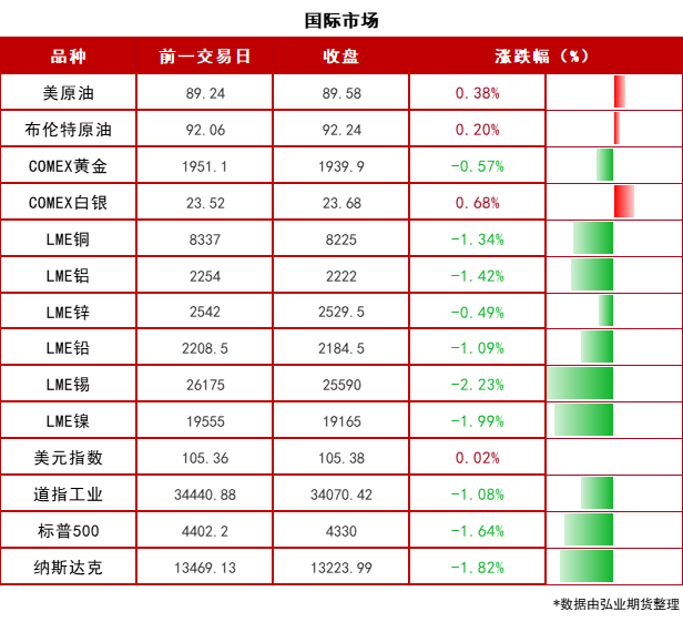 弘业期货 郑重声明:本资讯内容仅供参考,据此入市,风险自担 今日关注 有声有色圆桌论坛 9月22日(周五)15:30 隔夜市场 【隔夜要闻】 美国众议院共和党党内分裂致使第三次未能推进国防开支法案,政府停摆问题愈发迫切。此外,美国众议院共和党领导人周四宣布休会,这可能会使未来几天通过一项为政府提供资金的法案的希望破灭。 俄罗斯政府表示,于9月21日起对汽油、柴油出口实施全面禁令,但时长未知,这两种类型的能源出口规模约为100万桶/日。 英国央行周四维持利率不变,这是近两年来首次在对抗顽固的高通胀中选择不加息。英国央行行长贝利在声明中表示,近几个月来,通胀率大幅下降,这种情况将继续下去,但没有自满的余地。根据政策会议纪要,利率需要“在足够长的时间内保持足够的限制性”,以使通胀率回到央行2%的目标。 9月21日晚,韩国最大在野党共同民主党国会院内领导层集体辞职,该党事务总长也表明辞职意向。 根据国际清算银行的数据,与其他货币相比,日元实际有效汇率跌至53年来最低水平。 商务部:已批准了符合规定的若干镓、锗相关物项的出口申请。此外,商务部还表示,将推动出台支持汽车后市场发展等一批的政策举措。 北京发布外商投资条例的征求意见稿,着力促进资金跨境流动便利化。 上海市人民政府办公厅印发《上海市落实〈关于在有条件的自由贸易试验区和自由贸易港试点对接国际高标准推进制度型开放的若干措施〉实施方案》的通知。 【隔夜市场数据】