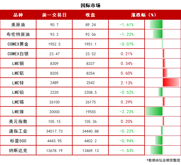 弘业期货 郑重声明:本资讯内容仅供参考,据此入市,风险自担 今日关注 能说汇化 9月21日(周四)15:30 走近期市新品种之集运指数(欧线)期货——透视集装箱航运产业链 美联储维持利率在5.25%-5.5%区间不变,点阵图则比想象中更鹰:预计今年会再加息一次,明年降息幅度较上次收窄50个基点,并大幅上调美国今年经济预期走势。鲍威尔在发布会上继续为潜在加息留有余地,并称软着陆是合理的前景。截至今晨,利率期货定价美联储11月加息的概率为30%,首次降息在明年9月份出现,明年底利率将至4.76%。 交易商表示,俄罗斯石油生产商在8月和9月向阿联酋供应了首批CPC混合原油,这表明在遭受西方制裁之际,俄罗斯开辟了一条新的出口路线。 俄第三大石油产商负责人:如果全球油市面临短缺,欧佩克+将采取行动。 美国至9月15日当周EIA原油库存减少213.5万桶,降幅略低于预期的220万桶,前值为增加395.5万桶。 央行货币政策司司长:人民币兑美元汇率非常重要,但并不是人民币汇率的全部,人民币兑一篮子货币汇率能更全面地反映货币价值的变化,货币政策应对超预期挑战和变化仍然有充足的政策空间。坚决对扰乱市场秩序行为进行处置,坚决防范汇率超调风险。 俄罗斯总统普京会见王毅。 国家发改委:自2023年9月20日24时起,国内汽、柴油价格每吨分别提高385元、370元,为年内第10次上调,以油箱容量50L的普通私家车计算,车主们加满一箱油将多花15元左右。