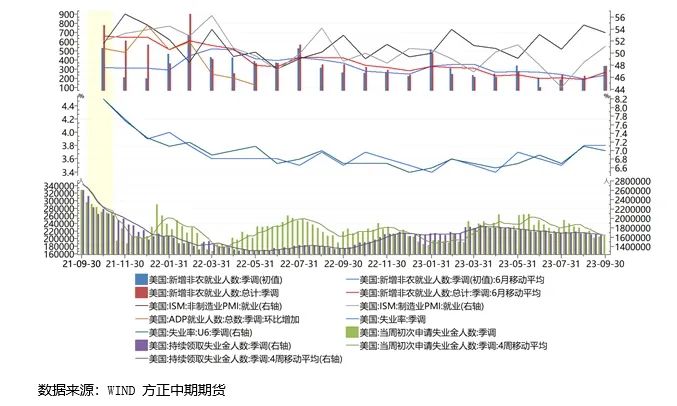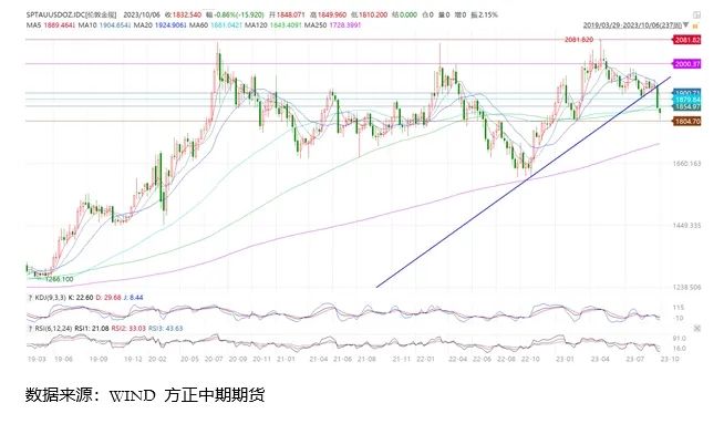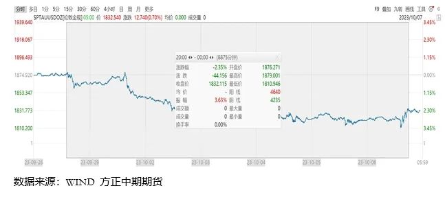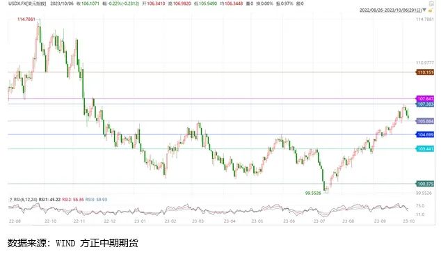 美元指数和美债收益持续走强后尾盘回落:第一,美国政府停摆风险解除降低经济衰退风险,利好美元指数和美债收益率;第二,美联储官员政策调整观点虽然存在分歧,但是整体依然偏鹰派,利好美元指数和美债收益率;第三,欧洲央行再度加息预期继续降温,欧洲经济衰退或难免,欧元偏弱利多美元指数;第四,美国国债供给大于需求,对美债收益率形成利好影响;上述因素综合影响下,美元指数和美债收益率持续走强,美元指数一度涨至107.35的近一年高位,十年期美债收益率一度涨至4.891%的近十五年高位。随着诸多利好被市场所计价与美联储官员戴利发表偏鸽派言论,尽管非农数据9月表现超预期形成利好影响,美元指数短暂上涨后再度回落至106.1附近,持续上涨行情或告一段落。美债收益率仍维持在高位,预计供过于求与经济政策差支撑下,仍将会维持高位一段时间。