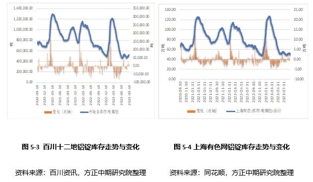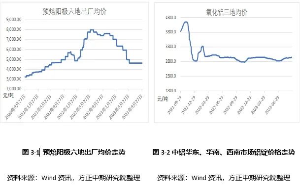 上游方面,节前中国预焙阳极市场成交价格持稳运行。截止放假前百川盈孚预焙阳极现货均价为4643元/吨,周环比下降4元/吨,节前原材料价格下行,整体成本端支撑力度减弱,国庆前夕,企业原材料备货较为积极,预焙阳极企业整体开工良好,少数企业仍处停产检修状态,现货市场供应充足,下游电解铝开工高位,预焙阳极需求良好。节前中国国产氧化铝价格延续上行走势。节前中国国产氧化铝均价为2937.99元/吨,较上一周均价上涨约8元/吨,涨幅约为0.27%。节前氧化铝市场成交节奏相较于前期有所放缓,部分下游电解铝企业节前采购,氧化铝市场偶传现货成交消息。其中河南地区成交氧化铝数量0.5万吨,出厂价格2970元/吨。山西地区传出两笔现货成交,共计成交数量2.5万吨,其中2万吨成交价格3000元/吨,流向下游电解铝厂;另外0.5万吨成交价格3050元/吨,为贸易商采购。广西地区成交0.3万吨氧化铝,出厂价格为3000元/吨。从以上成交可以看出,部分需方适量补库,氧化铝现货价格坚挺运行。 产能方面,据百川数据显示,截至2023年9月27日,中国电解铝建成产能(以有生产能力的装置计算4724.90万吨,开工4297.90万吨。截至2023年9月27日,2023年中国电解铝减产规模涉及177.2万吨,其中已减产167.2万吨,已确定待减产10万吨,或减产但未明确减产0万吨。截至2023年9月27日,2023年中国电解铝总复产规模367.7万吨,已复产330.2万吨,待复产29.5万吨,预期年内还可复产0万吨,预期年内最终实现复产累计330.2万吨。截至2023年9月27日,2023年中国电解铝已建成且待投产的新产能177.7万吨,已投产102.7万吨,待开工新产能73万吨,预期年内还可投产共计20万吨,预期年度最终实现累计122.7万吨。