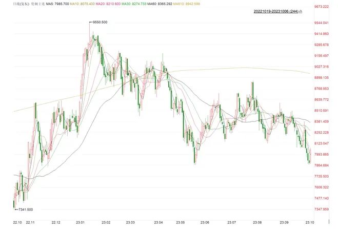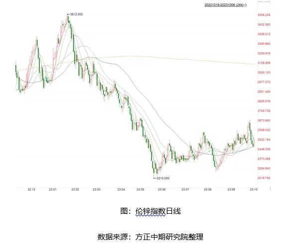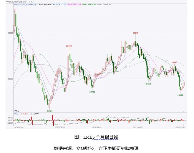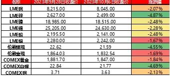 对于美债收益率而言,美债收益率供过于求状态将会持续,美欧经济差和政策差预期依然在走扩,美债收益率将会维持高位运行,不排除进一步上涨可能。十年期美债收益率上方关注5%关口,不排除涨至5.25%的可能;年底或将会再度回到4%以内。 第二部分 有色金属 铜:海外风险积聚 铜价偏弱运行 一、LME期货行情走势变化