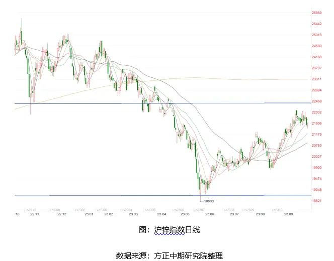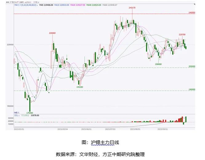 基本面供给方面,国内锡冶炼厂加工费暂时平稳,冶炼企业周度开工率环比小幅下降0.72%。缅甸佤邦禁矿还在继续,而选矿厂已于9月中下旬复产,8月锡精矿进口数据较好,但预计9月将大幅下降。近期沪伦比震荡整理,伦锡持续贴水,进口盈利窗口开启。需求方面,锡下游已步入消费旺季,实际表现略好但有限。8月锡焊料企业开工率较7月份上升5.28个百分点,但同比去年并无显著增长,预计9月还将维持涨势。9月第三周铅蓄电池企业开工周环比持平。库存方面,上期所库存继续下降,LME库存持续上涨,smm社会库存周环比下降。 精炼锡目前基本面略有好转,需求端也迎来传统旺季,但下游采购依然较为谨慎。供应端随着大厂检修的结束也有所恢复。佤邦禁矿事件市场牵动市场神经,各种消息可能随时刺激盘面,建议谨慎操作。假日期间外盘波动较大,整体呈现下跌态势,建议偏空思路为主。中长期延续区间震荡走势。需关注矿端供应情况及美指走势,上方压力位240000,下方支撑位205000。