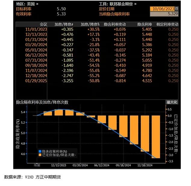 国际宏观形势和政治形势发生较大转变,美元指数和美债收益率大幅拉升,叠加供需基本面的负面影响,原油、有色金属和贵金属等商品均出现大幅回落,尾盘因为美元指数回落跌幅略有收窄;具体来看,CRB指数跌幅达到3.5%,原油跌幅达到12%,黄金跌幅接近2%,白银跌幅接近4%,有色金属整体走弱,锡和镍跌幅最大。 对于美联储而言,美国就业市场表现依然较为强劲,但是出现疲弱迹象,美国通胀因原油价格上涨和低基数效应而延续反弹行情,但是非全面性上涨,核心通胀依然偏下行,美国经济虽有韧性但仍偏下行,美国高利率影响将会继续显现;尽管美联储官员强调再度加息的可能性,市场预计美联储11月再度加息的预期接近30%,12月再度加息预期接近50%,美国通胀可能会延续一段时间反弹,但是我们认为美联储11月和12月再度加息可能性依然较小,最多是当前限制性利率水平持续时间将会延长,或延长至2024年三季度,三季度开启降息周期。