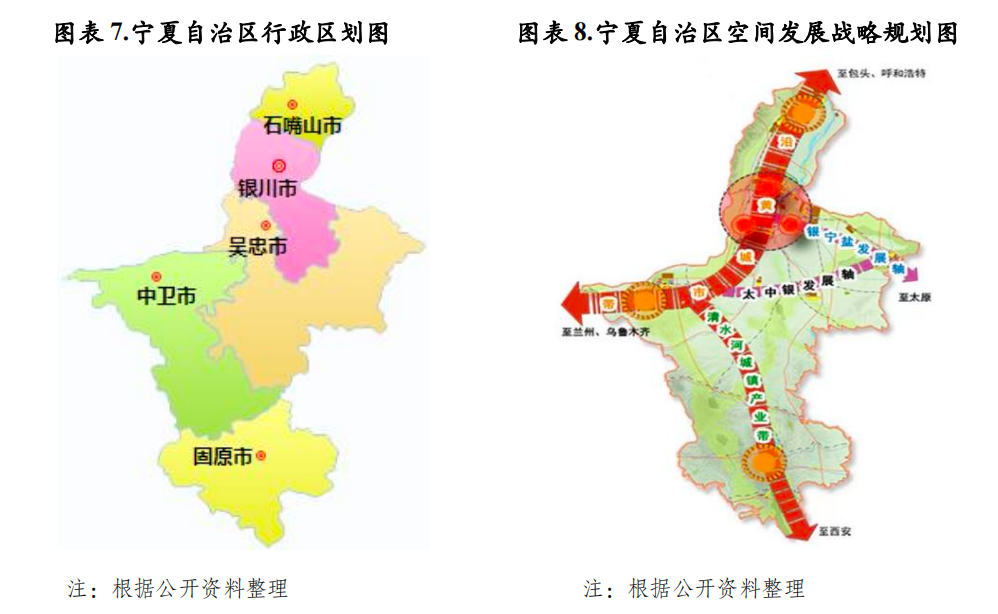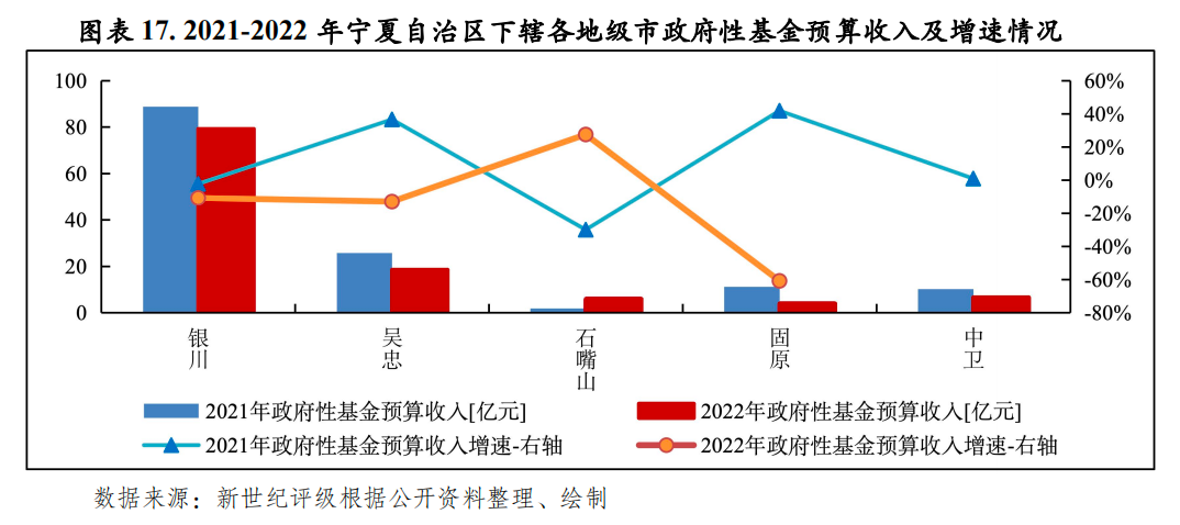 2022年,宁夏国有土地使用权出让收入同比下降19.1%至103.2亿元,拉动宁夏政府性基金收入较上年下降11.5%至129.24亿元。2022年,宁夏政府性基金支出同比下降15.8%至134.04亿元,主要系国有土地使用权出让收入安排的支出下降所致。2022年,全区政府性基金收入对政府性基金支出的覆盖程度同比提升37.27个百分点至99.38%。 2023年前三季度,宁夏完成一般公共预算收入385.70亿元,同比增长7.8%,其中税收收入277.04亿元,同比增长17.0%;一般公共预算支出1306.94亿元,同比增长4.2%。同期,宁夏全区一般公共预算自给率21.20%,较2022年全年下降7.77个百分点,财政收支矛盾仍较为突出。 从土地市场行情来看,2022年受房地产行业下行、房企融资不畅等因素影响,全区土地成交总价呈小幅下降态势,2022年宁夏实现土地成交总价101.24亿元,同比下降5.63%;宁夏土地出让主要集中在银川市,2022年银川市实现土地成交总价80.59亿元,占全区土地成交总价的79.60%。2023年前三季度,全区实现土地成交总价56.31亿元,同比增长12.76%,其中银川市实现土地成交总价36.33亿元,占全区土地成交总价的64.52%。 二、下辖各市经济与财政实力分析 宁夏地处黄河水系,城市沿黄河谷地和贺兰山山麓分布,下辖银川、石嘴山、吴忠、固原和中卫5个地级市。宁夏地势南高北低,呈阶梯状下降,整体分为北部引黄灌区、中部干旱带和南部山区。其中石嘴山、银川和吴忠市北部处银川平原,银川平原由黄河冲积平原与贺兰山洪积扇组成,地势平坦、土层深厚、引水方便,利于自流灌溉发展农业和畜牧业,为瓜果、枸杞等经济作物及奶产品的主要产区,被誉为“塞上江南”。其中银川市地理位置更为优越,是古丝绸之路商贸重镇,较早形成人口聚集,目前也是新亚欧大陆桥重要的节点城市,为宁夏的军事、政治、经济、文化、科研、交通和金融中心,目前银川市主导产业仍为煤炭、化工、电力等能源型产业,产业升级转型有待继续推进。石嘴山市位居黄河中游上段,宁夏最北端,拥有煤炭资源禀赋,是国家“三线”建设时期重点布局的老工业基地,由于粗放管理,煤炭资源枯竭,目前处于经济转型期。吴忠市北部处银川平原,南部为黄土丘陵、贺兰山和牛首山,是回族主要聚居区之一,吴忠市农业产业化程度较高,同时石油、天然气等矿产资源丰富,风能、光伏等新能源富集,电力资源充足,是宁夏重要的能源基地,目前也是新丝绸之路经济带重要的节点城市。中卫市位于宁夏回族自治区中西部,地处宁夏平原向黄土高原的过渡带,为西北地区第三大铁路枢纽。固原市位于宁夏回族自治区南部六盘山区,是陕甘宁革命老区振兴规划中心城市,也是宁夏回族自治区省域副中心城市。 根据《宁夏回族自治区国民经济和社会发展第十四个五年规划和2035年远景目标纲要》,宁夏将继续发挥银川中心城市辐射作用,带动石嘴山、吴忠、宁东协同发展,推动生态环境、基础设施、公共服务共建共享,未来将重点打造银川市光伏和电子信息材料、石嘴山市稀有金属、宁东基地化工新材料和高性能纤维材料三大产业集群,将银川市打造成内陆地区向西开放的区域性国际物流枢纽、区域性联运配送中心,将吴忠市打造成鲜活农产品物流集散基地,将石嘴山、中卫打造成区域性大宗商品集散交易基地,支持固原市建设区域中心城市。