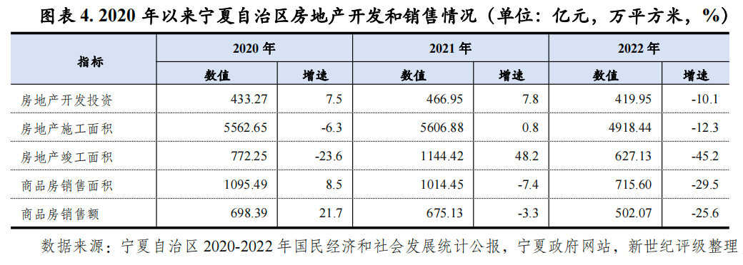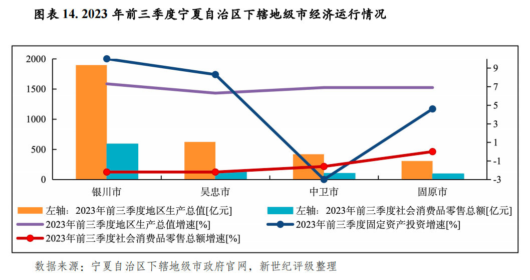 经济实力:宁夏位于黄河上游地区,地处黄土高原与内蒙古高原的过渡地带,地势南高北低,呈阶梯状下降,整体分为北部引黄灌区、中部干旱带和南部山区。宁夏依托自身资源禀赋形成了煤炭、电力、冶金、化工、建材等传统支柱产业,基本属于高耗能行业,产业链短,产品附加值低,近年来受过剩产能化解及环保政策影响,产业转型升级压力较大;得益于特色鲜明的旅游资源,宁夏旅游业保持较好的发展势头,以文化旅游为龙头的第三产业成为拉动全区经济增长的重要驱动力。受制于地理区位、复杂地形、自然禀赋以及“倚重偏能”的产业格局等,宁夏经济发展水平仍落后于全国水平。2022年,宁夏实现地区生产总值5069.57亿元,在全国31个省市中仍排名第29位;2022年以来在复杂严峻的外部环境等多重超预期因素冲击下,全区经济增速较上年下降2.7个百分点,但仍高于全国水平1.0个百分点。2023年前三季度,全区经济持续恢复向好、主要行业稳步发展,当期全区实现地区生产总值为3749.74亿元,同比增长6.4%,经济增速高于全国水平1.2个百分点。 2022年受宏观环境、房地产行业环境、土地市场行情影响,宁夏房地产市场仍呈现低迷状态,全区房地产市场投资端及销售端均遇冷,当年全区完成房地产开发投资额419.95亿元,同比下降10.1%,全区商品房销售额为502.07亿元,同比下降25.6%。此外,相较其他省份,宁夏可协调的地方金融机构资源相对较少,且上市公司数量及资产体量仍相对较小。受益于西部大开发、“一带一路”倡议的推进以及对内陆开放型经济试验区的持续建设,宁夏区域经济发展长期向好。 宁夏各地级市区域经济发展不均衡,首府银川市经济规模继续居于全区绝对领先地位,且在人口吸纳、二手房价格和土地出让金规模等方面均保持首位优势,而其他4个地级市的经济实力则明显薄弱。从人均指标来看,全区人均地区生产总值从北向南呈阶梯状下降,处银川平原的石嘴山和银川人均地区生产总值相对较高。2022年宁夏各地级市经济保持增长,但受复杂严峻的外部环境等多重超预期因素影响,经济增速均较上年有所放缓,消费市场亦受到一定冲击。2023年前三季度,宁夏各地级市经济均呈恢复向好趋势,除石嘴山市未披露前三季度经济运行情况外,其余地级市经济增速均呈明显增长。但受房地产市场、股市下行影响,全区消费市场仍呈现低迷状态,同期银川市、吴忠市和中卫市社会消费品零售总额较上年同期呈下降趋势,固原市社会消费品零售总额与上年同期持平。 财政实力:宁夏财政实力处全国下游水平,地方财政对中央补助以及土地出让收入依赖较大,2022年全区一般公共预算收入基本与上年持平,一般公共预算收入规模相较全国其他省市仍显著较小,税收比率仍较低。2022年,宁夏完成一般公共预算收入460.15 亿元,同口径增长 13.7%,收入规模仍位于全国31个省市的第29位,仅高于青海和西藏;同年税收比率较上年增长1.30个百分点至66.68%,在全国各省市中排名15位。作为少数民族自治区,宁夏仍持续获得较大规模的中央转移性支付,上级补助对全区实现财政收支平衡作用的重要性强,2022年得益于上级补助收入增加,全区财力规模保持增长。2023年前三季度,随着支柱行业回暖、企业盈利状况改善,全省一般公共预算收入保持增长,但财政收支矛盾仍较为突出;同期,全区土地市场景气度亦有所回升,土地出让仍集中于银川市。 与经济实力相匹配,宁夏下辖各地级市一般公共预算收入规模亦分化明显,首府银川市一般公共预算收入规模继续显著大于区内其他地级市。2022年宁夏下辖各地级市一般公共预算收入增速有所分化,吴忠、石嘴山和中卫一般公共预算保持增长,银川市和固原市一般公共预算收入规模较上年缩减,分别系税收和非税收入中的国有资源(资产)有偿使用收入下滑导致。宁夏各地级市一般公共预算自给能力总体较弱,一般公共预算收支平衡对上级补助的依赖程度大,2022年宁夏各地级市一般公共预算自给率均有所下降,其中银川和石嘴山一般公共预算自给率降幅在5%以上,其余3个地级市一般公共预算自给率小幅下降。同期,银川市政府性基金收入规模仍显著超过其他4个地级市,从地方财力对政府性基金预算收入依赖度来看,2022年固原和吴忠为政府性基金收入对财力贡献度最高的两个城市,石嘴山市政府性基金收入规模最小,其对财力贡献度最小。 债务状况:2022年末,宁夏政府债务规模仍相对小,为2236.90亿元;但政府债务与一般公共预算收入的比率仍处于全国相对高水平,2022年末该比率为4.34倍,位列全国36个省(区、直辖市、计划单列市)降序排列第13名。宁夏政府债务主要集中于下辖地市(占比71.84%),受限于自身财力,各地级市一般公共预算收入对其政府债务的覆盖程度整体较弱。宁夏实施政府债务全口径动态监测,各地级市能够严格遵循政府债务限额管理原则,2022年,全区化解隐性债务213亿元,隐性债务规模较峰值下降50%,全区已连续5年超额完成隐性债务化解任务,考虑到能够获得较大规模且持续性的上级补助,宁夏政府债务风险总体可控。 宁夏城投债存量规模与全国其他省市相比较小,2023年9月末为147.90亿元,全部集中于银川市本级和银川经开区。2023年9月末,全区存量城投债企业2022年末带息债务合计234.01亿元,居全国末位。2022年8月银川市进行国有企业重组整合,将银川市属国有企业