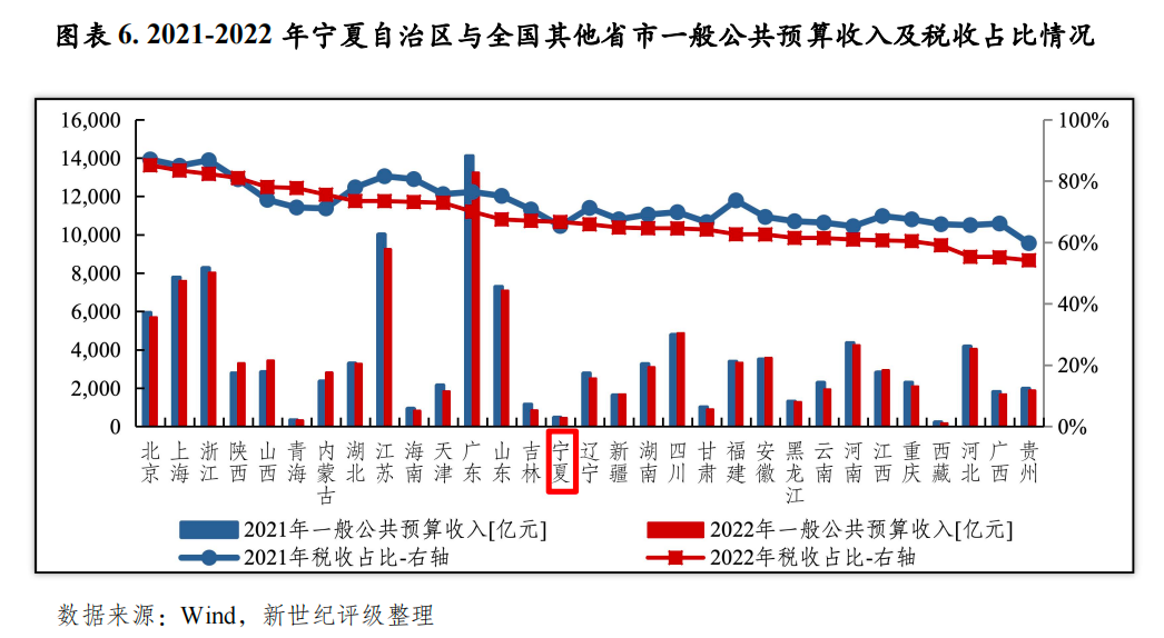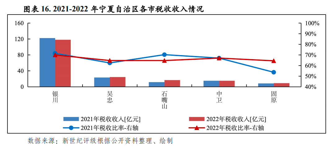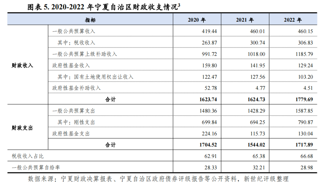 宁夏相较全国其他省市规模仍小,税收比率水平持续较低,收入质量仍有待提升。2022年,宁夏完成一般公共预算收入460.15 亿元,同口径增长 13.7%,收入规模仍位于全国31个省市的第29位,仅高于青海和西藏;同年全区一般公共预算收入占地区生产总值的比重为9.08%,较上年下降1.09个百分点。2022年,宁夏完成税收收入306.83亿元,同口径增长22.3%,当年税收比率较上年增长1.30个百分点至66.68%,税收比率在全国各省市中排名15位。受上年减税政策实行影响,2022年增值税同比下降15.26%至102.99亿元,占税收收入的比重较上年下降18.03个百分点至22.38%,仍为宁夏最主要税种;企业所得税、资源税、城市维护建设税、契税、房产税、个人所得税、城镇土地使用税规模亦相对较大,2022年分别为50.93亿元、36.55亿元、21.37亿元、19.53亿元、16.55亿元、13.13亿元和12.35亿元,占当年全区税收收入比重分别为16.60%、11.91%、6.96%、6.37%、5.39%、4.28%和4.03%。其中,资源税和企业所得税分别较上年增长43.17%和51.78%。2022年,宁夏一般公共预算支出为1587.85亿元,从支出结构看,2022年宁夏刚性支出(包括一般公共服务、公共安全、教育、社会保障和就业、卫生健康支出)规模合计790.87亿元,较上年下降13.92%。同年,宁夏刚性支出占一般公共预算支出比重较上年小幅上升1.20个百分点至49.81%;全区一般公共预算收入对刚性支出的覆盖程度较上年下降8.08个百分点至58.18%。宁夏一般公共预算平衡对上级补助的依赖程度高,2022年全区获得一般公共预算上级补助收入1185.79亿元,较上年增长16.48%。2022年,宁夏全区一般公共预算自给率为28.98%,较上年下降3.23个百分点。