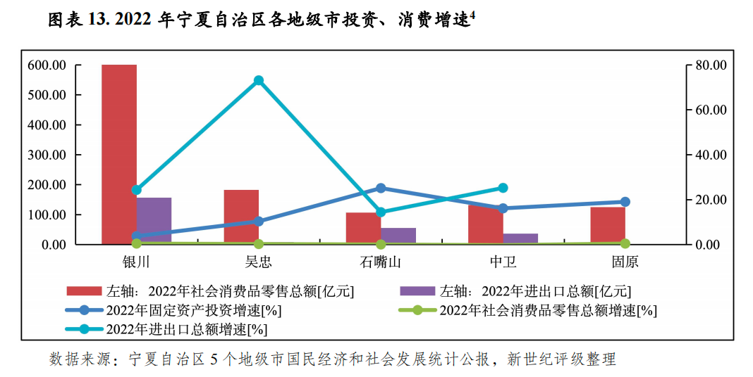 从三大需求看,投资和消费仍为拉动宁夏各市经济发展的主要动力。固定资产投资方面,2022年各市固定资产投资额均保持增长,其中石嘴山市增速最快,为25.1%,主要系采矿业、制造业及房地产开发投资增长拉动所致。固原市、中卫市和吴忠市固定资产投资额增幅亦较大,2022年增速分别为19.00%、16.10%和10.30%。同期,主要受重大项目投资完毕、储备项目不足等因素影响,银川固定资产投资额增速为3.7%,居全区末位。2022年超预期因素对消费市场产生明显冲击,2022年宁夏各地市社会消费品零售总额增速均较上年下滑。当期,银川、吴忠、中卫、固原和石嘴山社会消费品零售总额分别为791.62亿元、182.74亿元、131.89亿元、125.38亿元和106.81亿元,增速分别为0.4%、0.2%、-0.3%、0.4%和0%。
