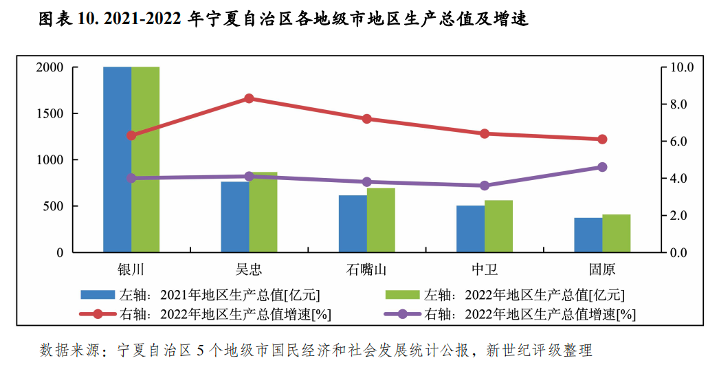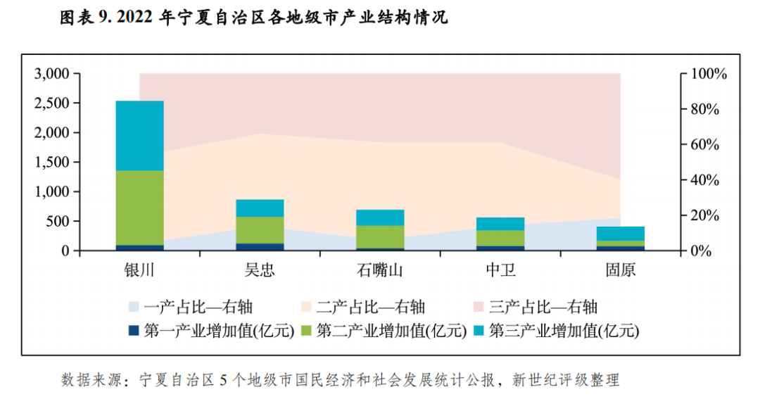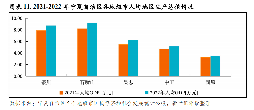 (一)下辖各市经济实力分析 宁夏各地级市区域经济发展不均衡,首府银川市经济规模继续居于全区绝对领先地位,且在人口吸纳、二手房价格和土地出让金规模等方面均保持首位优势,而其他4个地级市的经济实力则明显薄弱。从人均指标来看,全区人均地区生产总值从北向南呈阶梯状下降,处银川平原的石嘴山和银川人均地区生产总值相对较高。2022年宁夏各地级市经济保持增长,但受复杂严峻的外部环境等多重超预期因素冲击,经济增速均较上年有所放缓,消费市场亦受到一定冲击。2023年前三季度,宁夏自治区经济持续恢复向好,除石嘴山市未披露前三季度经济运行情况外,其余地级市经济增速均呈明显增长。但受房地产市场、股市下行影响,全区消费市场仍呈现低迷状态,同期银川市、吴忠市和中卫市社会消费品零售总额呈下降趋势,固原市社会消费品零售总额较上年同期持平。 从经济体量来看,宁夏各地级市区域经济呈明显分化格局。作为宁夏的经济、政治、文化中心,首府银川市经济规模继续居于全区绝对领先地位,而全区其他4个地级市的经济实力则明显薄弱。2022年,银川实现地区生产总值2535.63亿元,占全区地区生产总值的比重为50.04%,是全区唯一地区生产总值超2000亿元的城市。作为西北地区重要的能源化工城市,银川工业经济以煤炭、化工、电力等为支柱产业,由于主导产业以高耗能行业居多,尤其是宁东能源化工基地高载能项目的产能释放,使银川能源消费增量大,节能形势日益严重,近年来银川市政府重点推进过剩产能化解及产业转型升级,产业受政策影响较大,整体经济发展较缓。除银川外,其余4个地级市地区生产总值均不足千亿,2022年吴忠、石嘴山和中卫分别实现地区生产总值867.00亿元、693.34亿元和563.89亿元,经济规模最小的固原市仅实现地区生产总值409.68亿元,主要系固原市地处六盘山区,是宁夏唯一不临黄河的地级市,自然灾害频繁、生态环境恶劣、水资源匮乏使得工业发展严重受限,同时固原市工业发展结构性问题较为突出,煤电产业多年占据工业半壁江山,“倚重偏能”格局难以改变,受环保政策影响部分企业关停,区域工业发展水平相对落后。 从三次产业结构看,除固原外,其余各市均为“二三一”产业结构,第二产业为拉动其经济增长的主要动力。固原市共有旅游景区14个,其中4A级旅游景区6个,文化旅游等现代服务业较发达,同时由于固原工业产值规模较小,第三产业占主导地位;银川市作为宁夏经济、金融中心,商贸服务业发达,商业资源高度集聚,二产、三产增加值接近,但2022年受多重因素叠加影响,商贸服务业受到较大冲击,当年第二产业占比超过第三产业成为其经济发展的主要驱动力。从第一产业占比来看,除银川市和石嘴山市外,其余三个地级市一产占比均较高。固原市、中卫市和吴忠市由于工业发展水平不高,粮食、草畜产业和酿酒葡萄等第一产业在其产业结构中占比较高,2022年上述三个地级市一产占比分别为18.3%、14.2%和13.9%,较高的一产占比对当地经济发展产生一定擎制作用。
