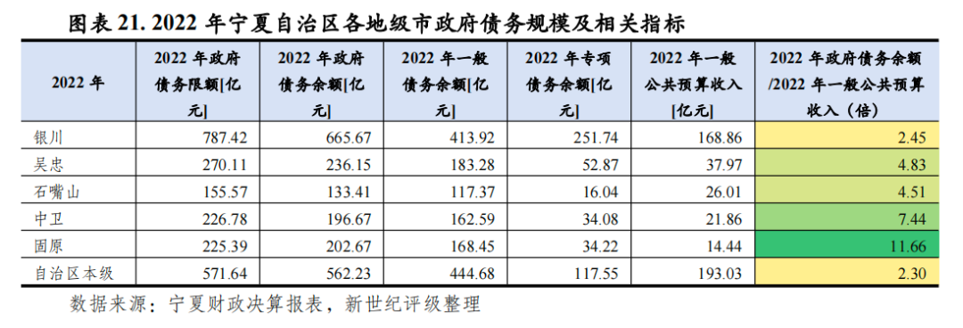 债务风险管理及预警方面,宁夏回族自治区政府党委、人民政府高度重视政府性债务管理工作,出台了《自治区人民政府关于加强政府性债务管理的意见》、《宁夏回族自治区地方政府债券管理办法》、《关于进一步加强政府性债务管理的实施意见》、《关于加强政府投资项目管理坚决防范政府性债务风险的通知》等一系列制度办法。宁夏自治区全面落实政府债务限额管理政策,在财政部核定的限额范围内,根据债务风险、财力等情况将政府债务限额分配给自治区本级及各县市。宁夏自治区严格落实债务统计报告制度,在原有政府债务季报、年报基础上,明确存量债务和新增债务的填报口径、统计查询、上报时限、检查考评等要求。宁夏将地方债务管理情况纳入市县效能管理考核,以此强化市县政府的责任意识和债务管理能力,具体通过债务率、新增债务率、偿债率等指标对各地区进行综合债务风险评估和预警。对局部风险较高地区,除控制其新增债务规模缓释风险外,宁夏还积极督促指导上述地区制订中长期债务风险化解规划,要求其提出切实可行的风险化解措施和应急处置预案等。同时,全区坚决遏制新增隐性债务,对发现的部分新增隐性债务线索高度重视,逐项清查规范,及时整改消除隐患;规范全区融资平台管理,积极推动融资平台加快转型,重点关注城投债务到期兑付风险,加强统筹协调,压实属地责任,坚决打赢防范化解城投债重大风险攻坚战,牢牢守住不发生区域性系统性风险底线。 2020年,宁夏成功争取永宁县建制县隐性债务风险化解全国试点,获得永宁县再融资债券55.00亿元。全区隐性债务总量较2018年上报中央规模下降30%以上,红色高风险等级地区数量从7个下降到3个。 2021年,宁夏成功推进银川市PPP规范化债及交投集团隐性债务剥离工作,连续三年超额完成政府隐性债务化解任务;对部分政府购买服务、棚改项目到期贷款本金17.63亿元实施债务重组,稳妥偿还债务资金7.85亿元;调整市本级支出预算24.9亿元,重新安排用于化解新增政府隐性债务、老旧小区和城市特色街区改造、疫情防控、公交成本规制等12个方面的支出。2021年10月,国务院办公厅关于部分债务沉重地区违规兴建楼堂馆所问题进行公开通报,其中宁夏闽宁会议中心、宁夏闽宁镇酒店管理与服务职业技能实训中心和宁夏丝路明珠塔三个项目存在在建设资金没有落实的情况下擅自开工建设,或安排财政资金用于宾馆维修改造和运营等问题,通报指出地方政府债务风险较高地区要进一步强化财政支出约束,大力压缩非刚性非重点支出,筑牢“三保”(保基本民生、保工资、保运转)防线,同时加强财政可承受能力评估,杜绝超越财力安排支出,防范化解财政运行风险。 截至2022年末,全区政府全口径债务总额较2021年末减少139亿元,总体债务率较2020年下降17个百分点。2022年,全区化解隐性债务213亿元,隐性债务规模较峰值下降50%,连续5年超额完成隐性债务化解任务,红色风险等级地区从7 个下降为3 个,债务率下降17 个百分点,全区政府债务总量、债务率实现双下降。 2023年5月16日,宁夏国有资本运营集团有限责任公司、宁夏农垦集团有限公司、宁夏交通投资集团有限公司等自治区重点国有企业及银川通联资本投资运营集团有限公司、银川金融资本投资集团有限公司等银川市属国有企业共同出资发起设立宁夏国有企业信用保障基金,基金首期规模为10.00亿元,目标总规模为30.00亿元,由宁夏国有资本运营集团有限责任公司担任管理人。宁夏国企信用保障基金将专项用于防范自治区、银川市两级国有企业公开市场债券信用风险,为国有企业发债提供增信,稳定企业存续债券二级市场价格,为企业降低融资成本、实现高质量发展提供有力支撑。 (二)下辖各市债务状况分析 宁夏政府债务主要集中于各下辖地级市,2022年末各下辖地级市政府债务余额合计占全区政府债务余额的比重为71.84%,银川市政府债务规模最大,已超越其余4市政府债务余额合计数,达665.67亿元;同年末,吴忠市、固原市和中卫市政府债务规模次之,分别为236.15亿元、202.67亿元和196.67亿元;石嘴山市政府债务规模相对较小,为133.41亿元。从2022年末政府债务余额与当年一般公共预算收入倍数水平看,受财力水平及收入结构等因素影响,宁夏各地级市该指标水平总体较高。其中,固原市该指标为11.66倍,为宁夏地区最高水平;中卫、石嘴山和吴忠市分别为7.44倍、4.51倍和4.83倍;银川市该指标相对最低,为2.45倍。
