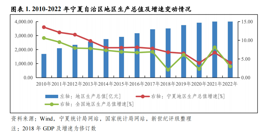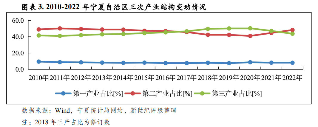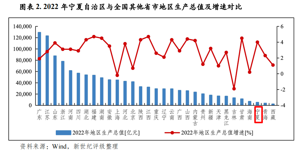 一、宁夏自治区经济与财政实力分析 (一)宁夏自治区经济实力分析 宁夏位于黄河上游地区,地处黄土高原与内蒙古高原的过渡地带,受制于地理区位、复杂地形、自然禀赋以及“倚重偏能”的产业格局等,经济发展水平相对落后。宁夏依托自身资源禀赋形成了煤炭、电力、冶金、化工、建材等传统支柱产业,基本属于高耗能行业,产业链短,产品附加值低,近年来受过剩产能化解及环保政策影响,产业转型升级压力较大;得益于特色鲜明的旅游资源,全区旅游业保持较好的发展势头,以文化旅游为龙头的第三产业成为拉动全区经济增长的重要驱动力。2022年以来在复杂严峻的外部环境等多重超预期因素冲击下,全区消费市场仍呈现低迷状态,但固定资产投资保持较快增长,增幅居全国第三位。受益于西部大开发、“一带一路”倡议的推进以及对内陆开放型经济试验区的持续建设,宁夏区域经济发展长期向好。 宁夏自治区位于我国西部的黄河上游,东邻陕西省,西、北部接内蒙古自治区,西南、南部和东南部与甘肃省相连,面积6.64万平方公里,下辖5个地级市和22个县、市(区)。截至2022年末,宁夏自治区全区常住人口728.0万人;根据《宁夏回族自治区第七次全国人口普查公报》,截至2020年11月1日零时,宁夏自治区全区常住人口720.27万人,其中回族人口占比为35.04%,是全国最大的回族聚居区。宁夏地处新亚欧大陆桥和中国-中亚-西亚经济走廊的节点位置,是我国向西开发路陆通道的重要节点,区位优势突出。 受益于西部大开发、“一带一路”倡议的实施、对内陆开放型经济试验区的持续建设,2022年宁夏经济总体保持增长,但全区经济体量仍相对小。2022年,宁夏实现地区生产总值5069.57亿元,在全国31个省市中仍排名第29位;按可比价格计算,同比增长4.0%,2022年以来在复杂严峻的外部环境等多重超预期因素冲击下,经济增速较上年下降2.7个百分点,但仍高于全国水平1.0个百分点。受制于地理区位、复杂地形、自然禀赋以及“倚重偏能”的产业格局等,宁夏经济发展水平仍落后于全国水平,2022年按常住人口计算的宁夏人均地区生产总值69781元,为同口径全国水平的0.81倍。