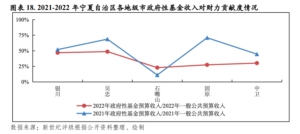 以政府性基金收入与一般公共预算收入的比率作为区域财力贡献度参考指标,根据测算,2022年除石嘴山外,其余4个地级市该指标同比均有所下降。具体数值看,银川、吴忠、石嘴山、中卫、固原该比率分别为46.91%、48.64%、22.89%、27.42%和30.19%,吴忠超越银川成为政府性基金收入对财力贡献度最高的城市,石嘴山市和固原市政府性基金收入规模最小,对财力贡献度最小。