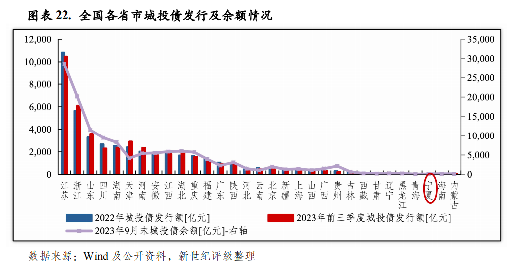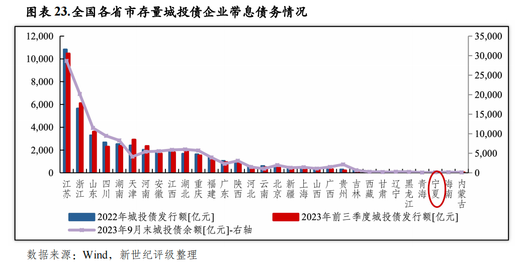 从存量城投债企业带息债务规模看,宁夏整体规模小,全区2023年9月末城投债存续企业2022年末带息债务余额合计234.01亿元,居全国末位;其与2022年全区一般公共预算收入比为0.51倍,居于全国31个省市降序排列第30位,较上年上升1位。其中,银川市本级存量城投债企业2022年末带息债务为204.56亿元,与2022年银川市本级一般公共预算收入比为2.25倍;银川经开区存量城投债企业2022年末带息债务为29.45亿元。