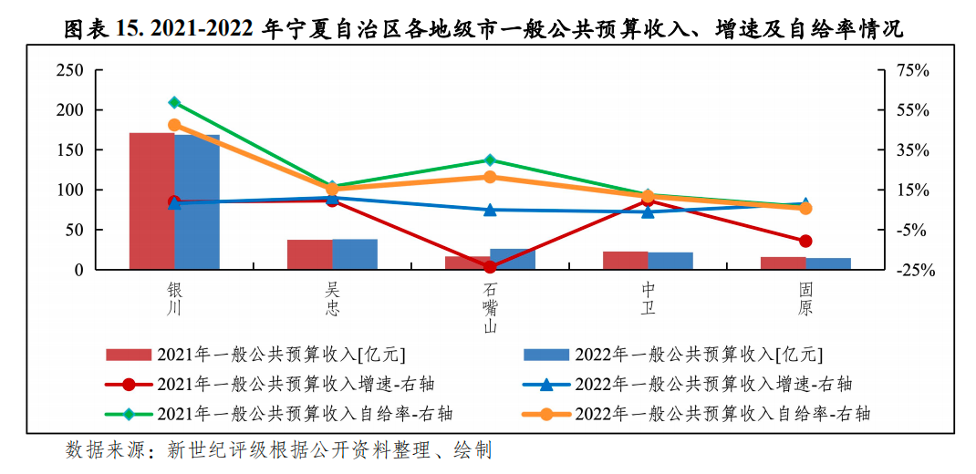(二)下辖各市财政实力分析 1.下辖各市一般公共预算分析 与经济实力相匹配,宁夏下辖各地级市一般公共预算收入规模亦分化明显,首府银川市一般公共预算收入规模继续显著大于区内其他地级市。2022年宁夏下辖各地级市一般公共预算收入增速有所分化,吴忠、石嘴山和中卫一般公共预算保持增长,银川市和固原市一般公共预算收入规模较上年缩减,分别系税收和非税收入中的国有资源(资产)有偿使用收入下滑导致。宁夏各地级市一般公共预算自给能力总体较弱,一般公共预算收支平衡对上级补助的依赖程度大,2022年宁夏各地级市一般公共预算自给率均有所下降,其中银川和石嘴山一般公共预算自给率降幅在5%以上,其余3个地级市一般公共预算自给率小幅下降。 受经济发展水平差异影响,宁夏各地级市一般公共预算收入规模亦分化明显。2022年石嘴山市一般公共预算收入规模超过中卫市,其他地级市一般公共预算收入排名较上年未发生变动。2022年,银川市以168.86亿元的一般公共预算收入继续大幅领先;其余4市一般公共预算收入均不足40.00亿元,按降序排列,吴忠市、石嘴山市、中卫市和固原市依次为37.97亿元、26.01亿元、21.86亿元和14.11亿元。从一般公共预算收入增速看,2022年除固原市和银川市外,宁夏其余地级市一般公共预算收入均保持增长,但增速有所分化,吴忠、石嘴山和中卫一般公共预算收入增速分别为11.00%、4.90%和3.83%;同期,银川市一般公共预算收入较上年下降1.36%,系税收收入下降导致,固原市一般公共预算收入较上年下降10.80%,主要系非税收入中的国有资源(资产)有偿使用收入减少所致。