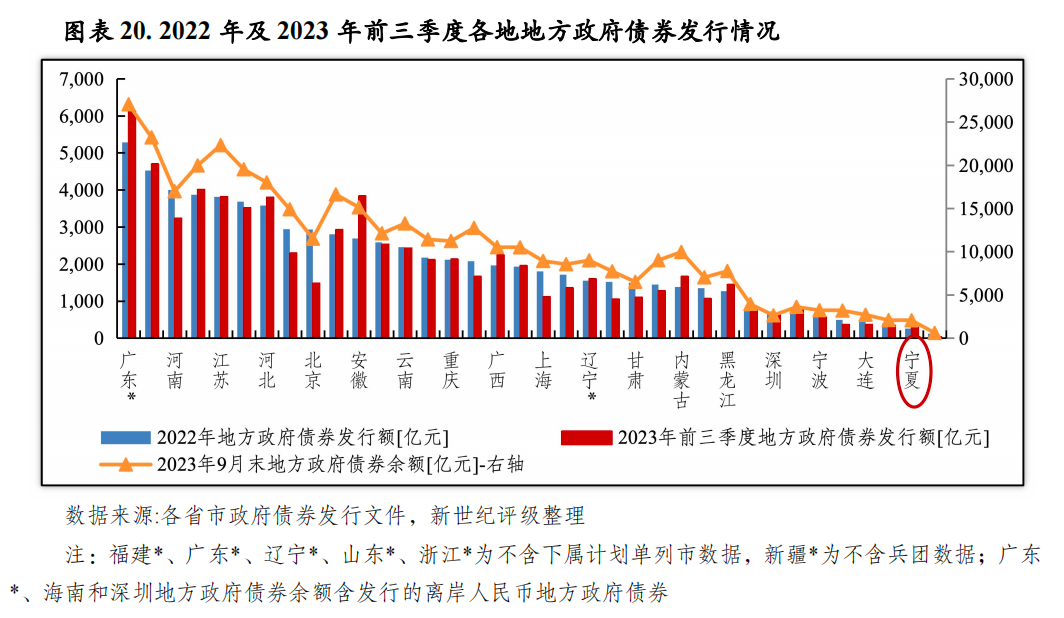 2022年,宁夏发行地方政府债券257.84 亿元,其中,新增一般债券84.84亿元,新增转型债券18亿元;发行再融资一般债券120亿元,再融资专项债券35亿元。 2023年宁夏地方政府债务新增限额150亿元。2023年前三季度,宁夏发行地方政府债券291亿元,其中新增债券114亿元,再融资债券177亿元。2023年9月末,宁夏地方政府债券存量余额为2054.12亿元。 2023年10月,宁夏发行特殊再融资债券80亿元,募集资金用于偿还存量债务。