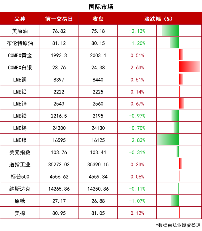 弘业期货 文:金融研究院分析师 郑重声明:本资讯内容仅供参考,据此入市,风险自担 【隔夜要闻】 据称欧佩克+接近与非洲产油国就2024年产量配额问题达成一致,一位不愿透露姓名的消息人士表示,他“有99%的信心”认为欧佩克+可能在11月30日达成协议。 巴以临时停火协议正式生效,双方完成第一轮和第二轮被扣押人员交换。哈马斯:致力于达成“全面交换协议”并完全解除对加沙封锁;以色列总理:将致力于让所有以方被扣押人员获释,对每释放10名人质就延长一天停火的可能性表示欢迎。 俄罗斯副总理诺瓦克:相信在不久的将来会就土耳其天然气枢纽的实施达成协议。 乌克兰空军当地时间11月25日通报称,俄罗斯当天凌晨向基辅方向发射了75架无人机,系俄乌冲突爆发以来最大规模的无人机袭击。 欧洲央行行长拉加德:抗通胀战斗尚未结束;已在利率上做了很多工作,现在可以进行观察。管委穆勒认为可能不需要再提高利率。副行长金多斯也表示,维持当前利率水平足够长时间将控制通胀。 澳大利亚将对澳洲联储进行改革,其中包括废除财政部否决央行货币政策决定的权利。 印度计划将地下煤矿开采量增加两倍。 【隔夜市场数据】